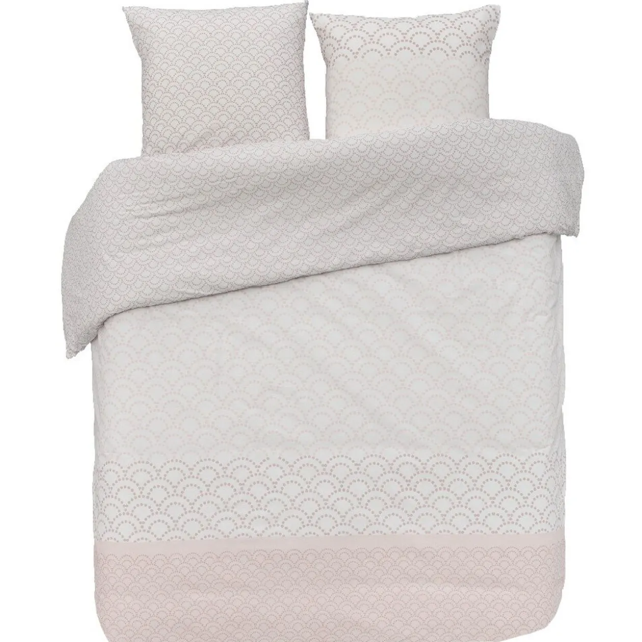 Optez pour du linge de lit simple et moderne grâce à cette parure de lit 2 personnes blanche et rose imprimée de demi-lunes.
