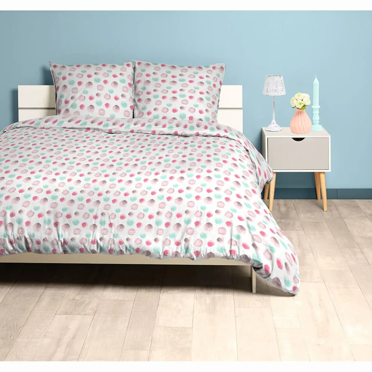 Apportez une touche colorée à votre chambre grâce à cette parure de lit pour 2 personnes blanche imprimée pois multicolores.