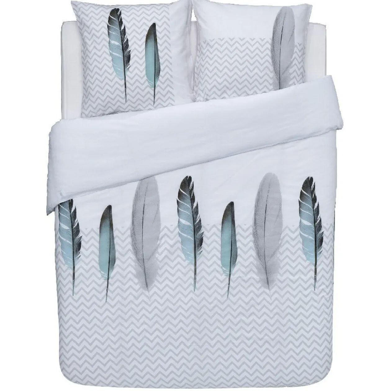 Cette parure de lit blanche imprimée zig zag gris et agrémentée d’un joli décor de plumes dans les tons bleu turquoise, idéal pour apporter du charme et de la douceur à la décoration de votre chambre.