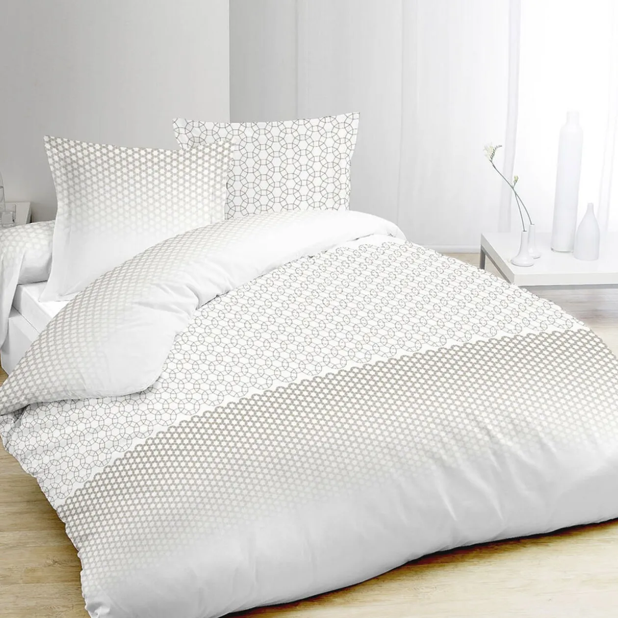 Parure de lit 2 places imprimée rosaces taupe blanc
