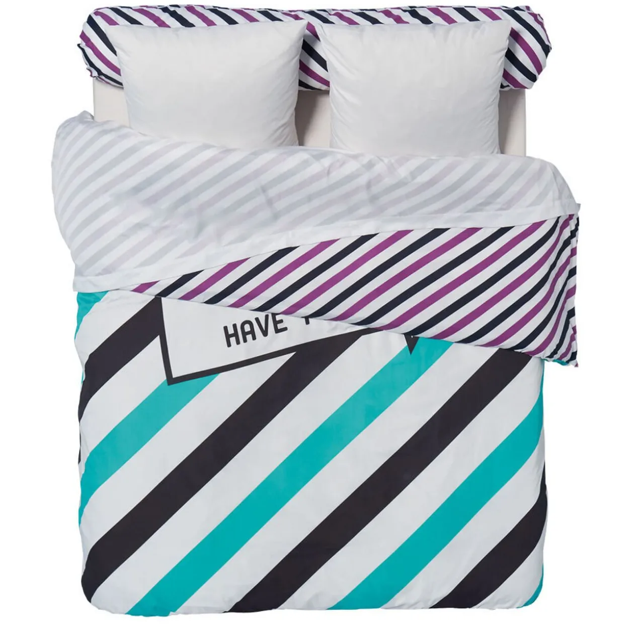 Parure de lit 2 places motif rayures et inscription « enjoy life & have fun » comprenant 1 housse de couette dim. 220×240 cm, 2 taies d’oreiller dim. 63×63 cm, 1 drap plat dim. 240×300 cm, 1 taie de traversin dim. 45×185 cm et 1 drap housse dim. 140×190 cm, polyester microfibre.