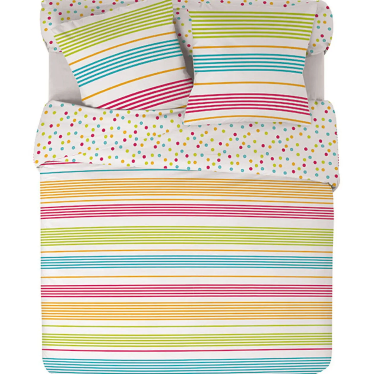 Parure de lit motifs rayures 6 pièces comprenant 1 housse de couette 240×220 cm, 2 taies d’oreillers 63×63 cm, 1 taie de traversin, 1 drap housse 140×190 cm, 1 drap plat 240×300 cm, polyester microfibre.