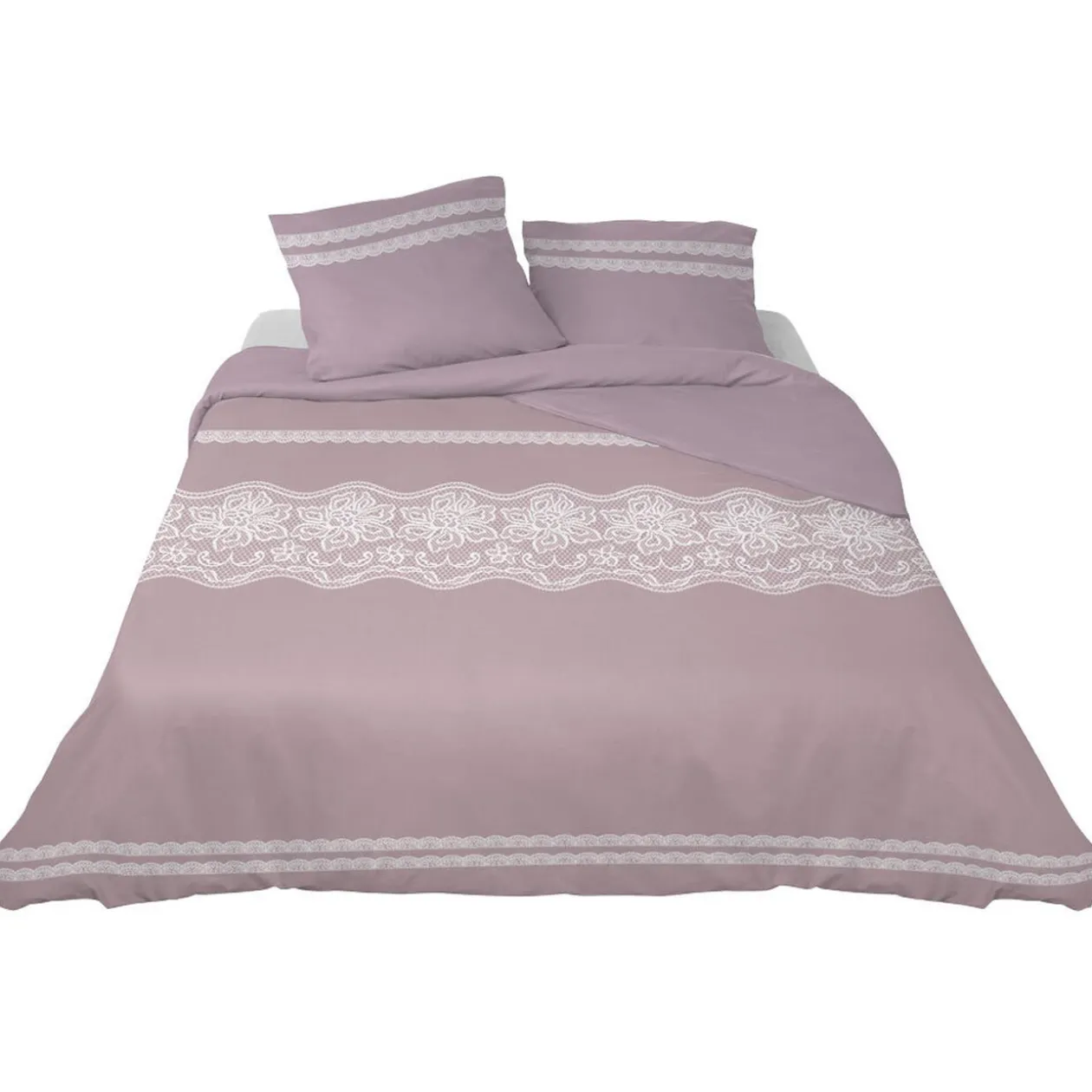 Parure de lit 2 places rose à dentelle comprenant 1 housse de couette dim. 220×240 cm et 2 taies d’oreillers dim. 63×63 cm, coton 57 fils.