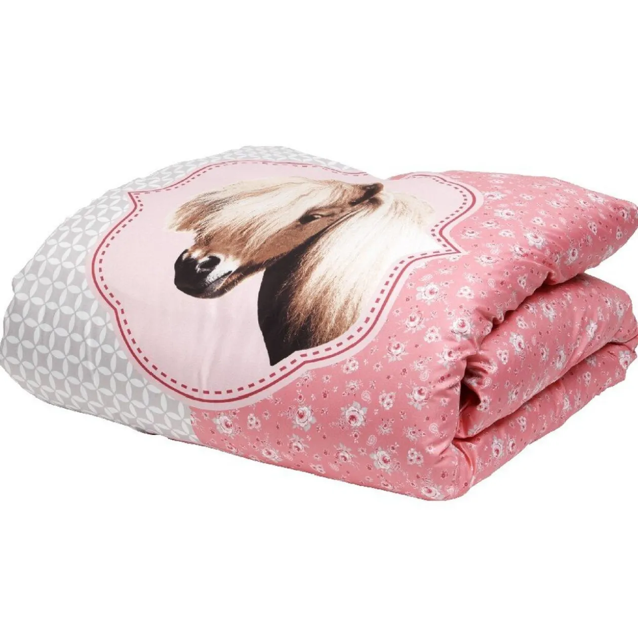 Parure de lit2 places rose et blanche motif Poney comprenant 1 housse de couette dim. 140×200 cm et 1 taie d’oreiller dim. 63×63 cm, polyester et coton.