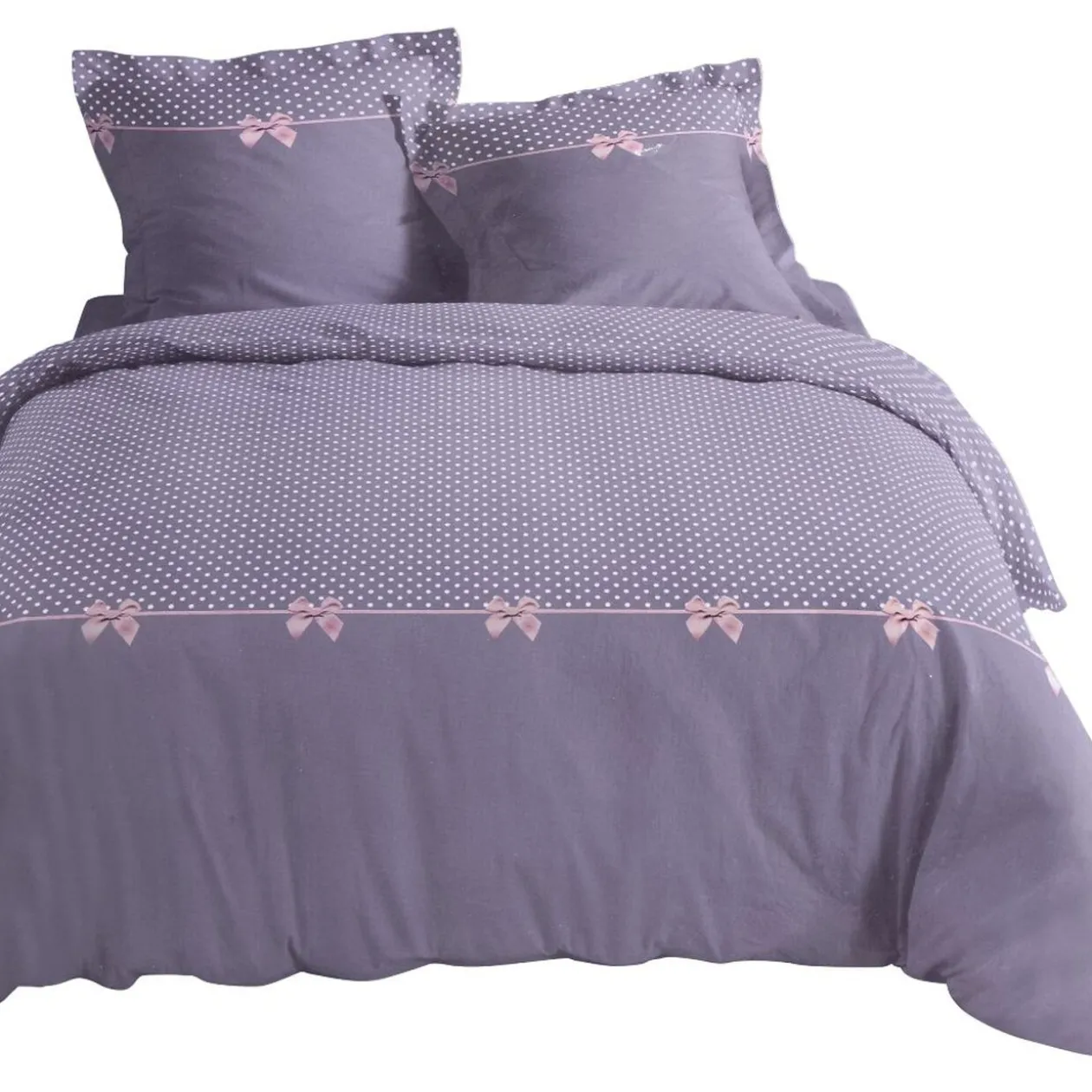 Cette parure de lit grise à imprimé pois avec petits noeuds roses sera du plus effet dans une chambre au style romantique. Elle se compose d’une housse de couette 240×220 cm pour 2 personnes et de 2 taies d’oreillers 63×63 cm assorties.