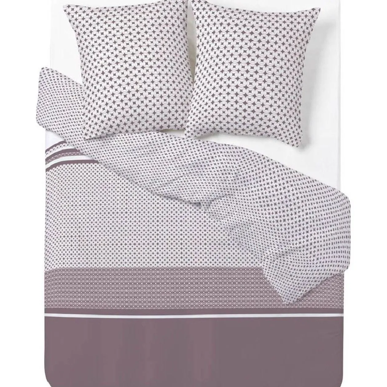 Parure de lit marron et blanche avec motifs géométriques et frise horizontale. Apportez à votre décoration de chambre, une touche cosy et discrète à la fois !