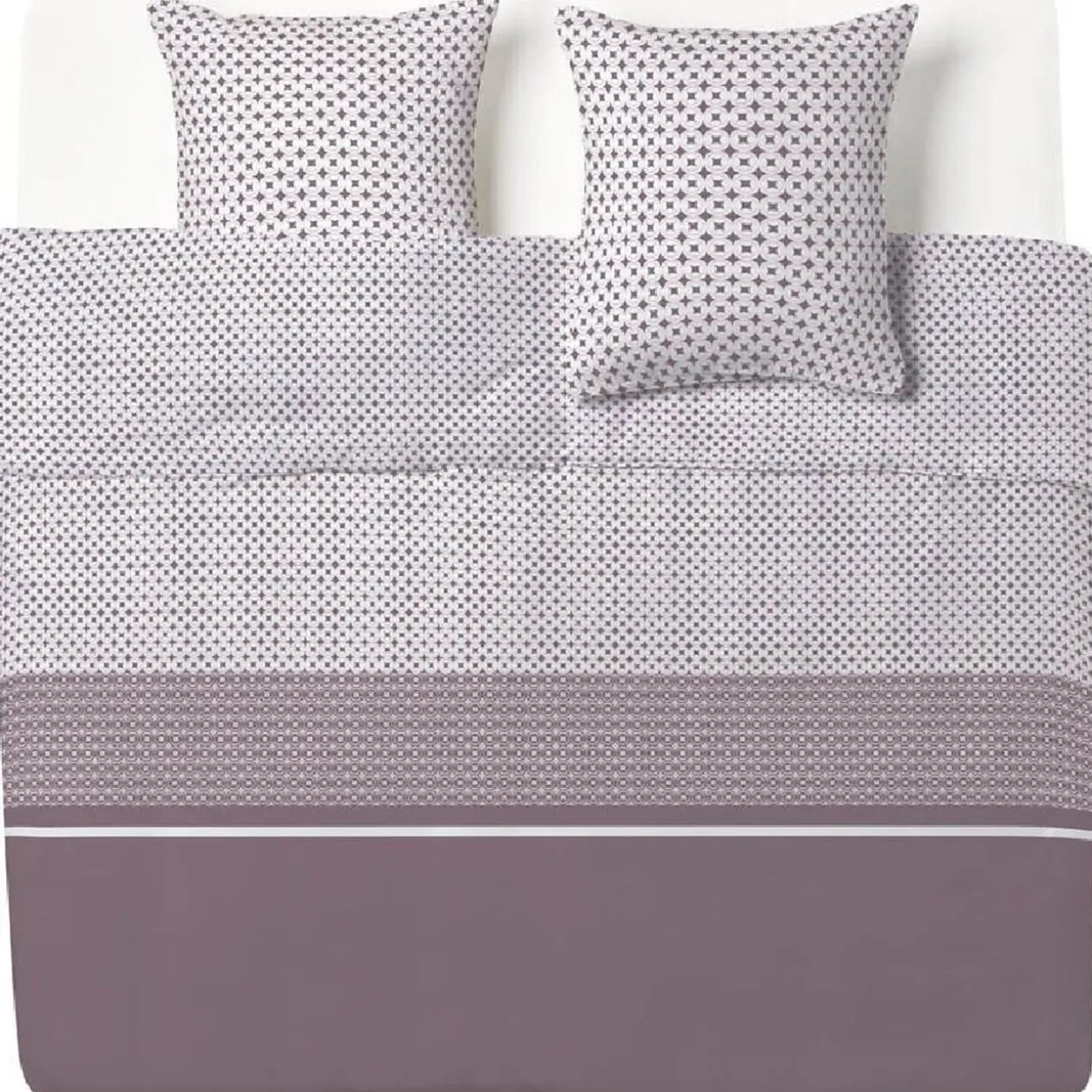Parure de lit marron et blanche avec motifs géométriques et frise horizontale. Apportez à votre décoration de chambre, une touche cosy et discrète à la fois !