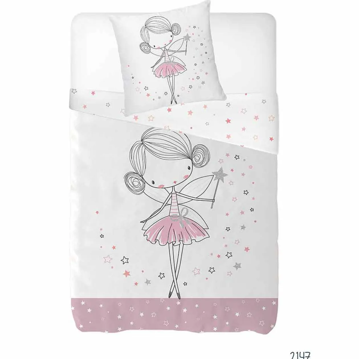 Jolie parure de lit blanche avec une fée représentée, parsemée d’étoiles pailletées et de couleur rose. Idéale pour une petite fille !