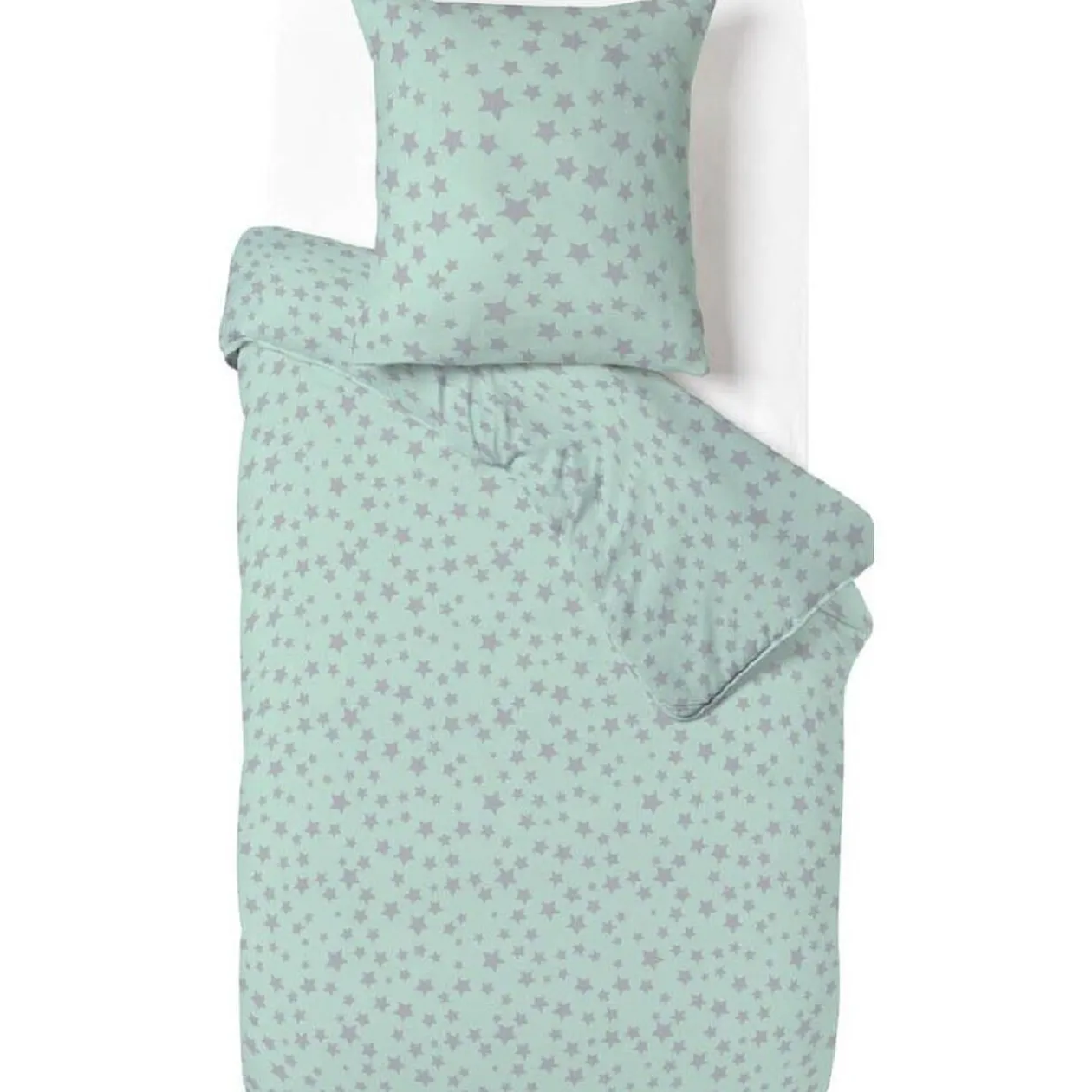 Parure de lit verte avec motifs étoiles grises. Cette parure comprend une housse de couette et sa taie d’oreiller assortie.
