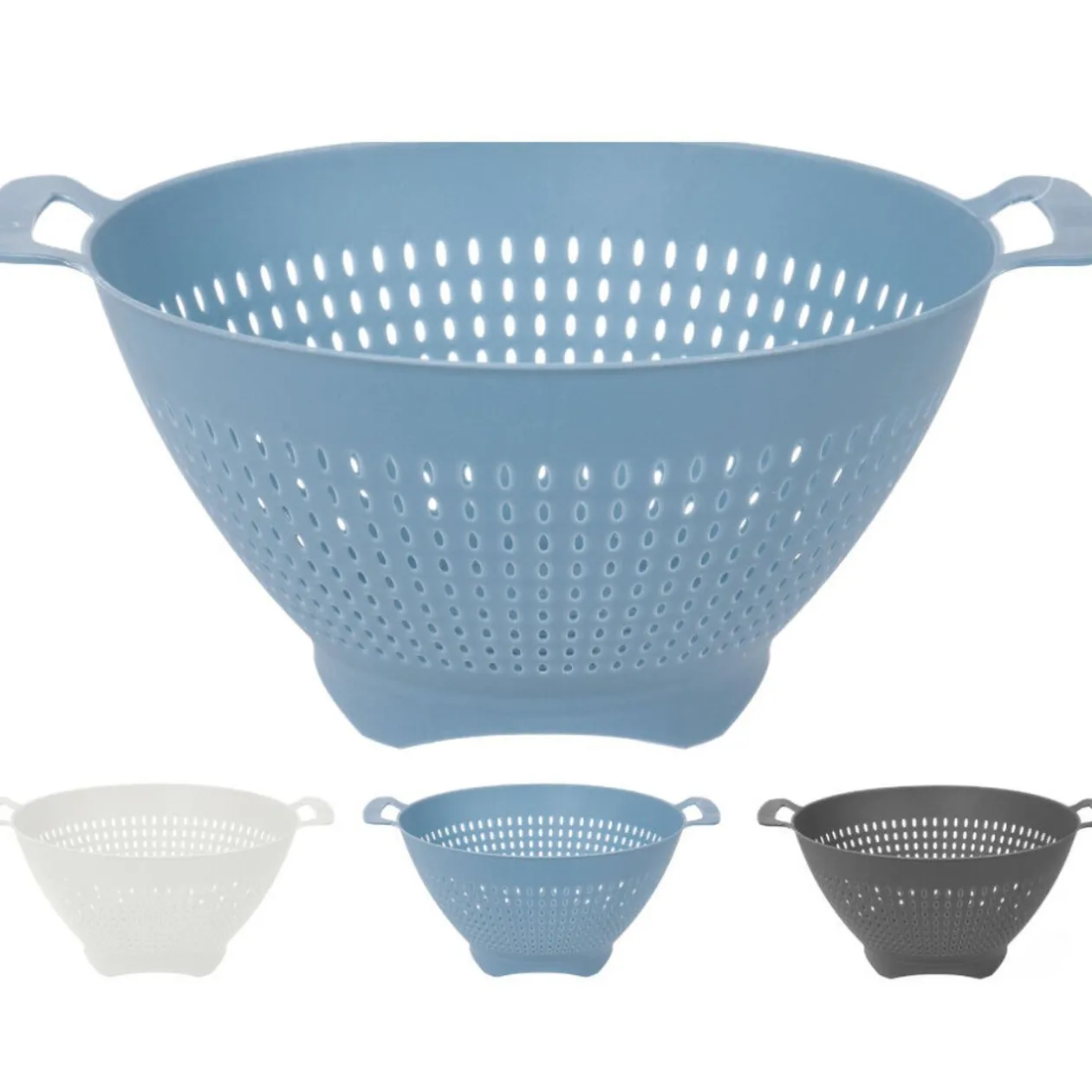 Passoire ronde en plastique avec deux poignées.