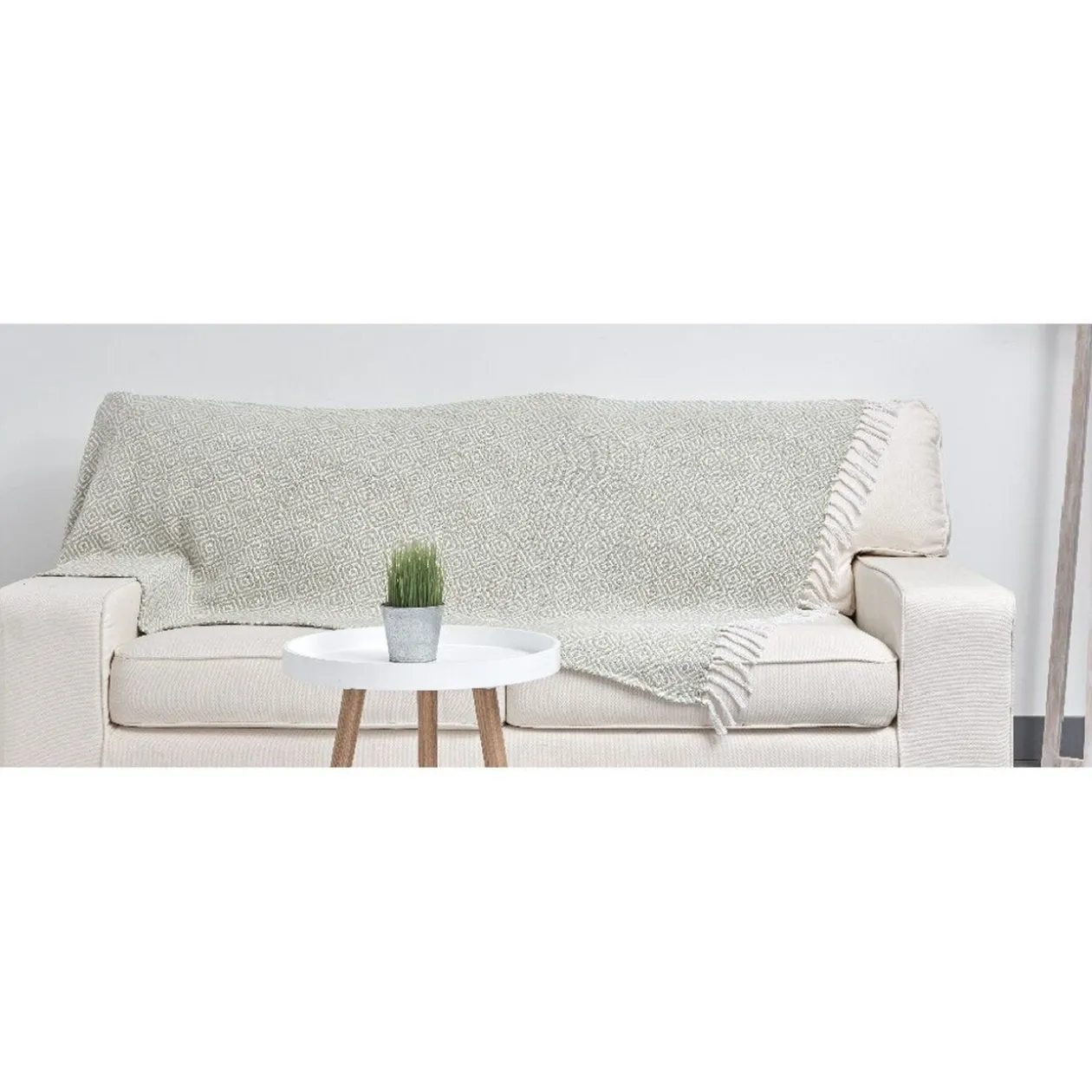 Plaid à franges blanc et vert d’eau.
