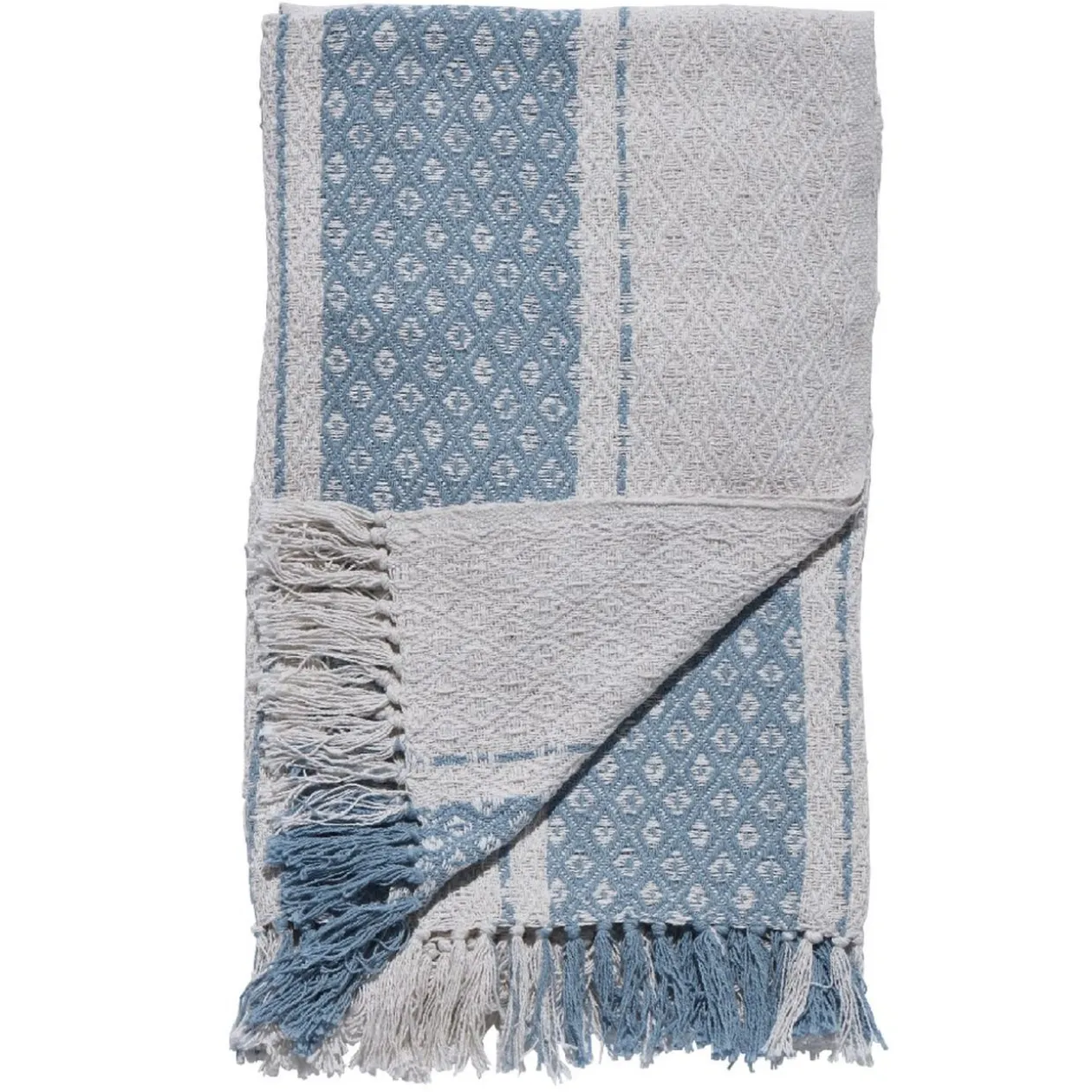 Bordé de franges, ce plaid blanc décoré blandes bleues 100% en coton est aussi très doux et agréable d’utilisation.