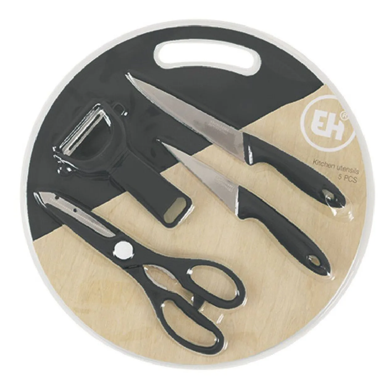 Contient une planche à découper + un ciseau + un éplucheur + 2 couteauxCe produit existe en 3 modèles/coloris, modèle aléatoire selon disponibilité en magasin- Couleur : Blanc / Bleu / Noir- Dimensions : D31,7 x H3cm- Matière(s) : Inox