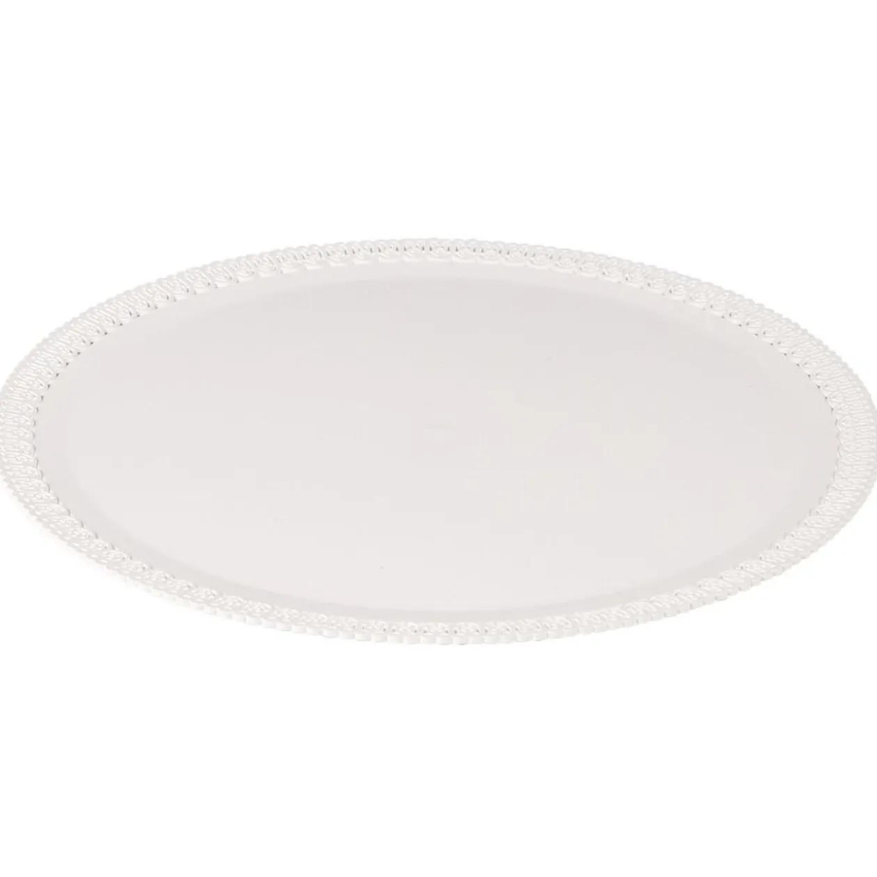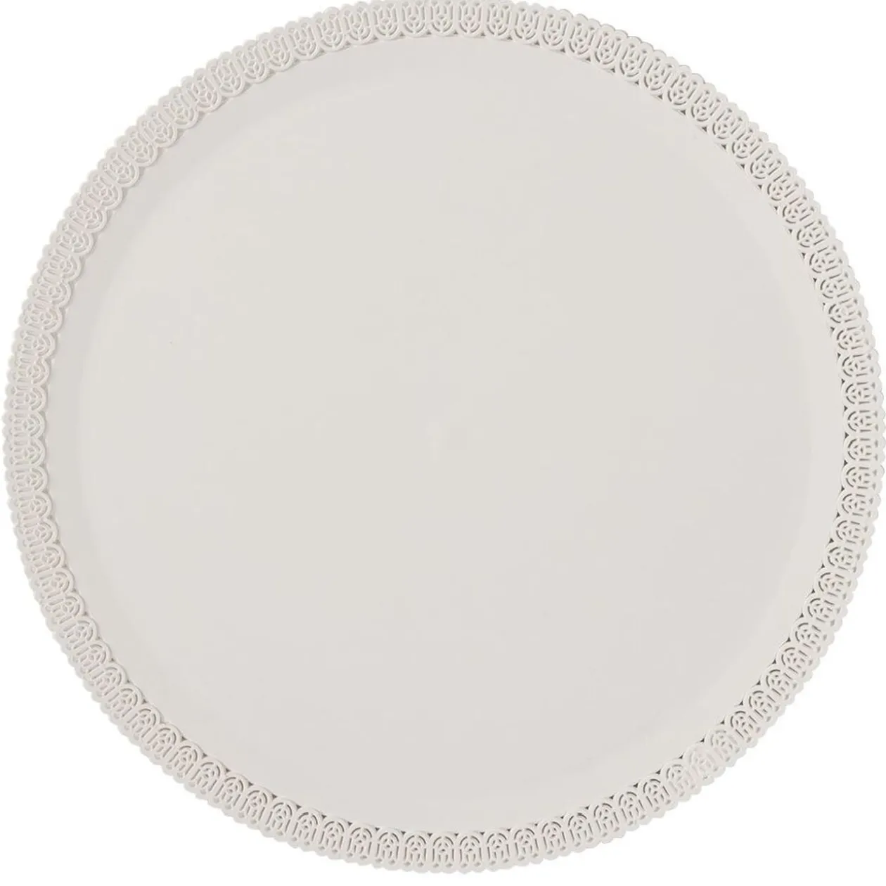 Plateau de présentation pour gâteau rond en plastique blanc avec joli décor en relief sur tout le contour.
