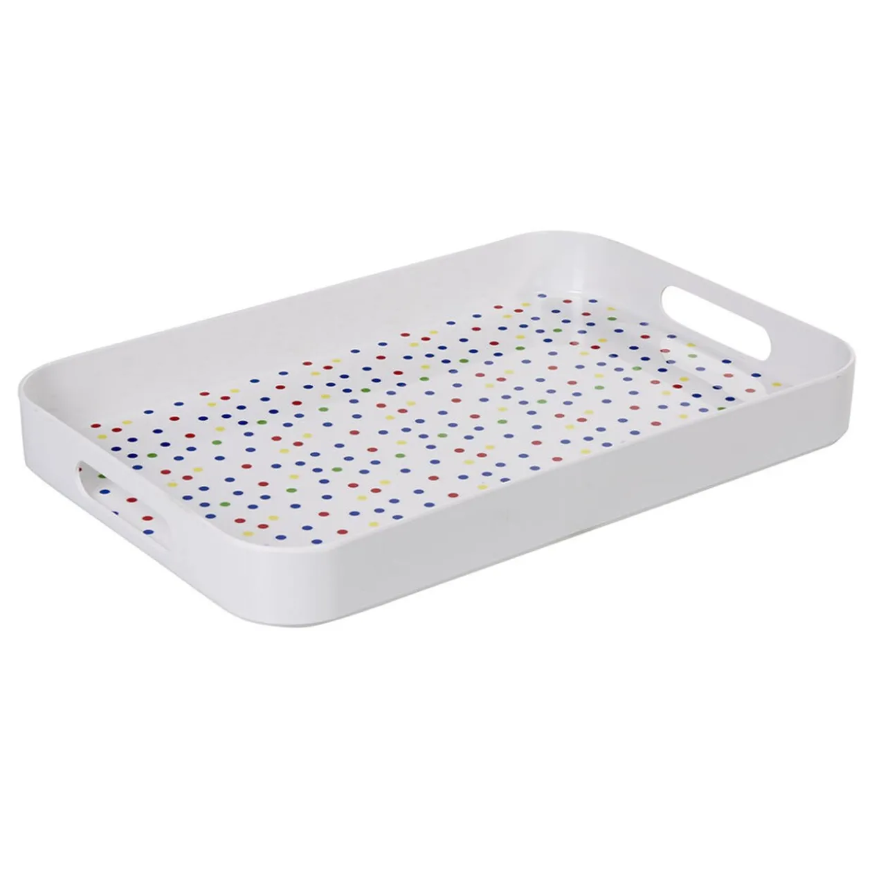 Plateau en plastique mélaminé blanc et intérieur à motif pois multicolores.