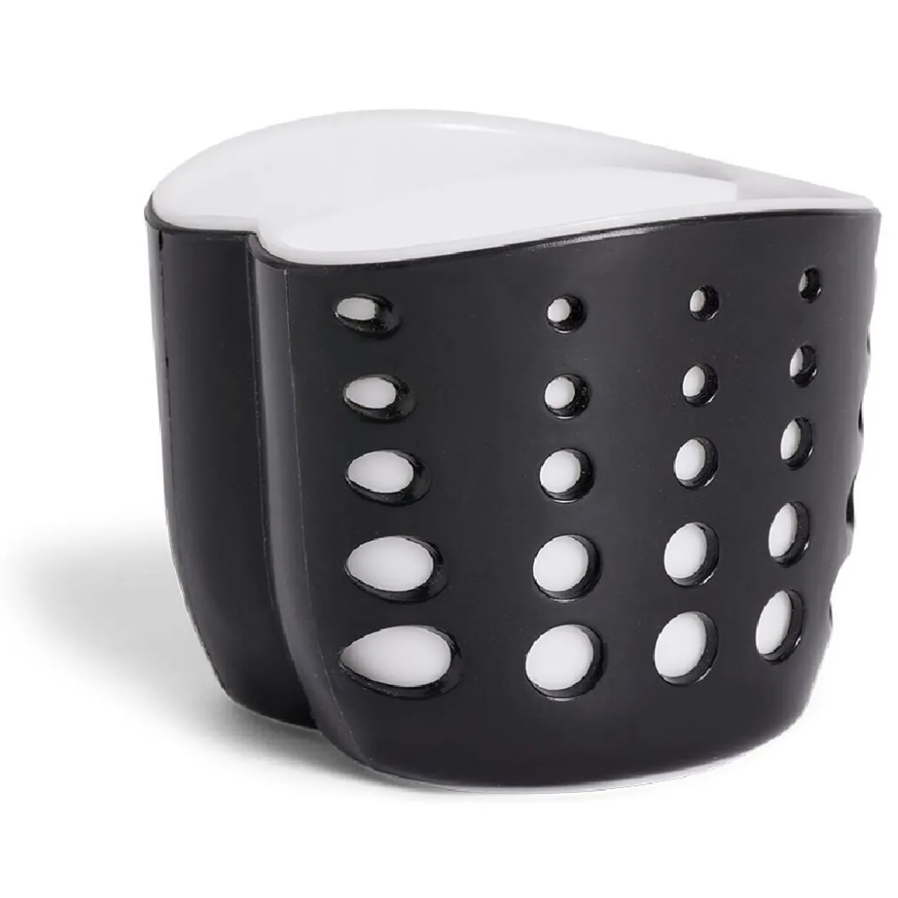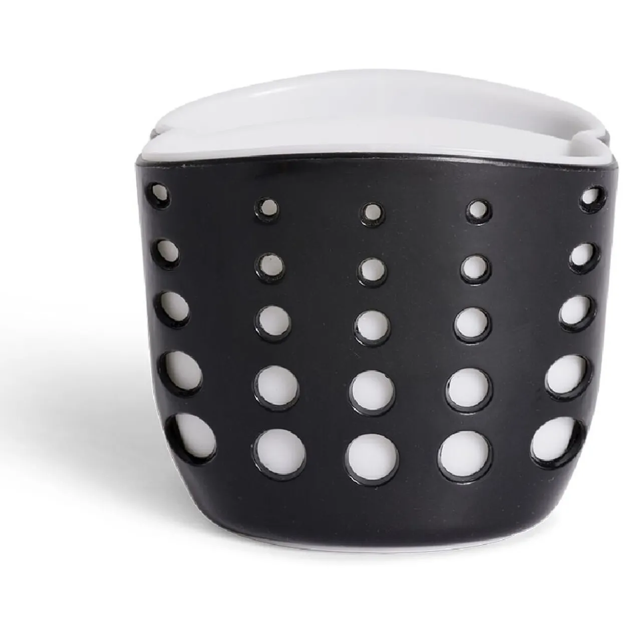 Porte-éponge en plastique noir et blanc avectrous pour laisser évacuer l’humidité. Idéal pour garder un évier propre et bien organisé.