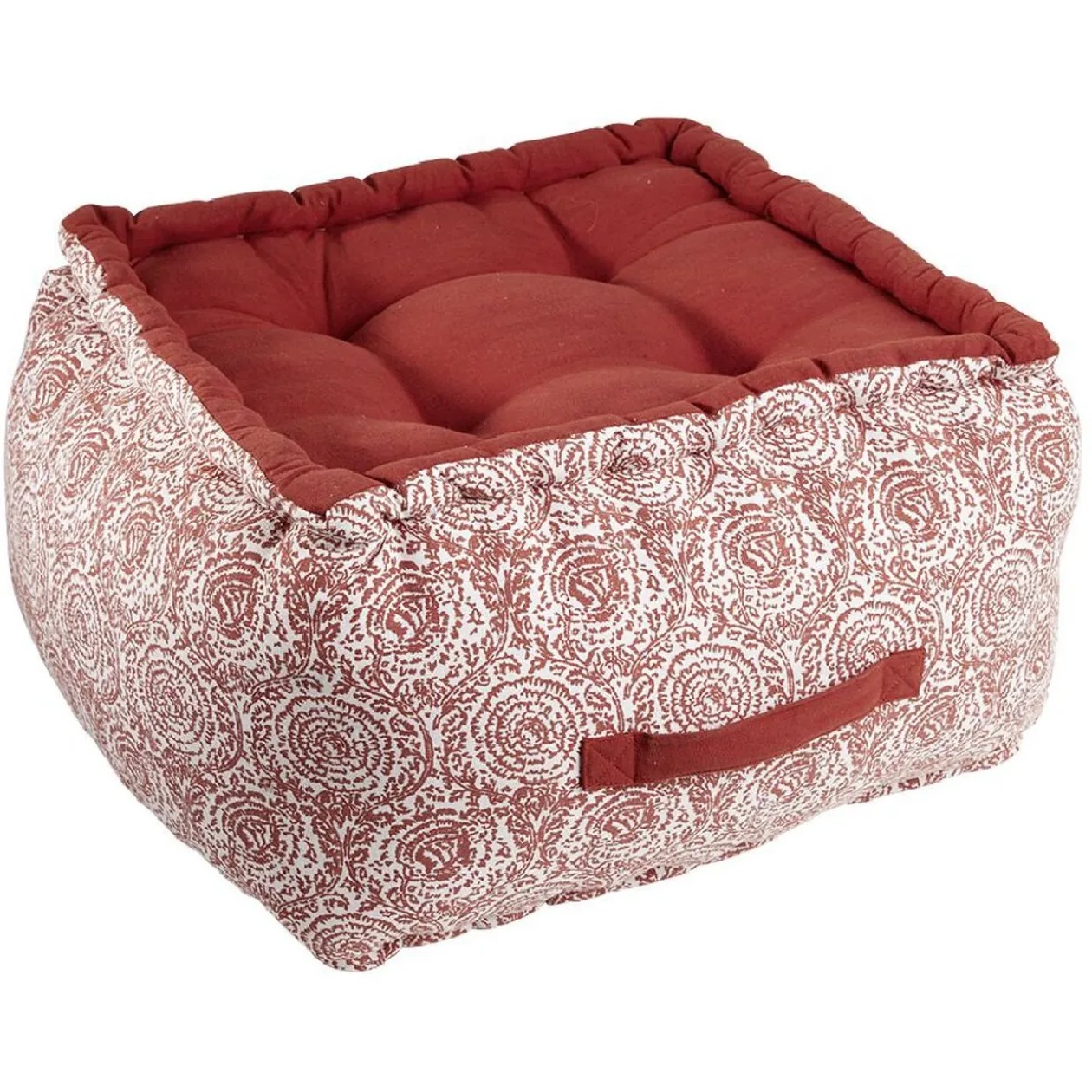 Un pouf carré avec imprimé de style ethnique et aux couleurs chaudes pour passer d’agréables moments confortablement assis au sol.