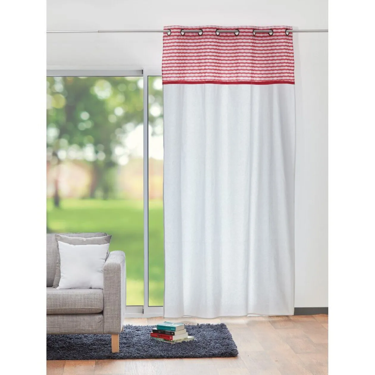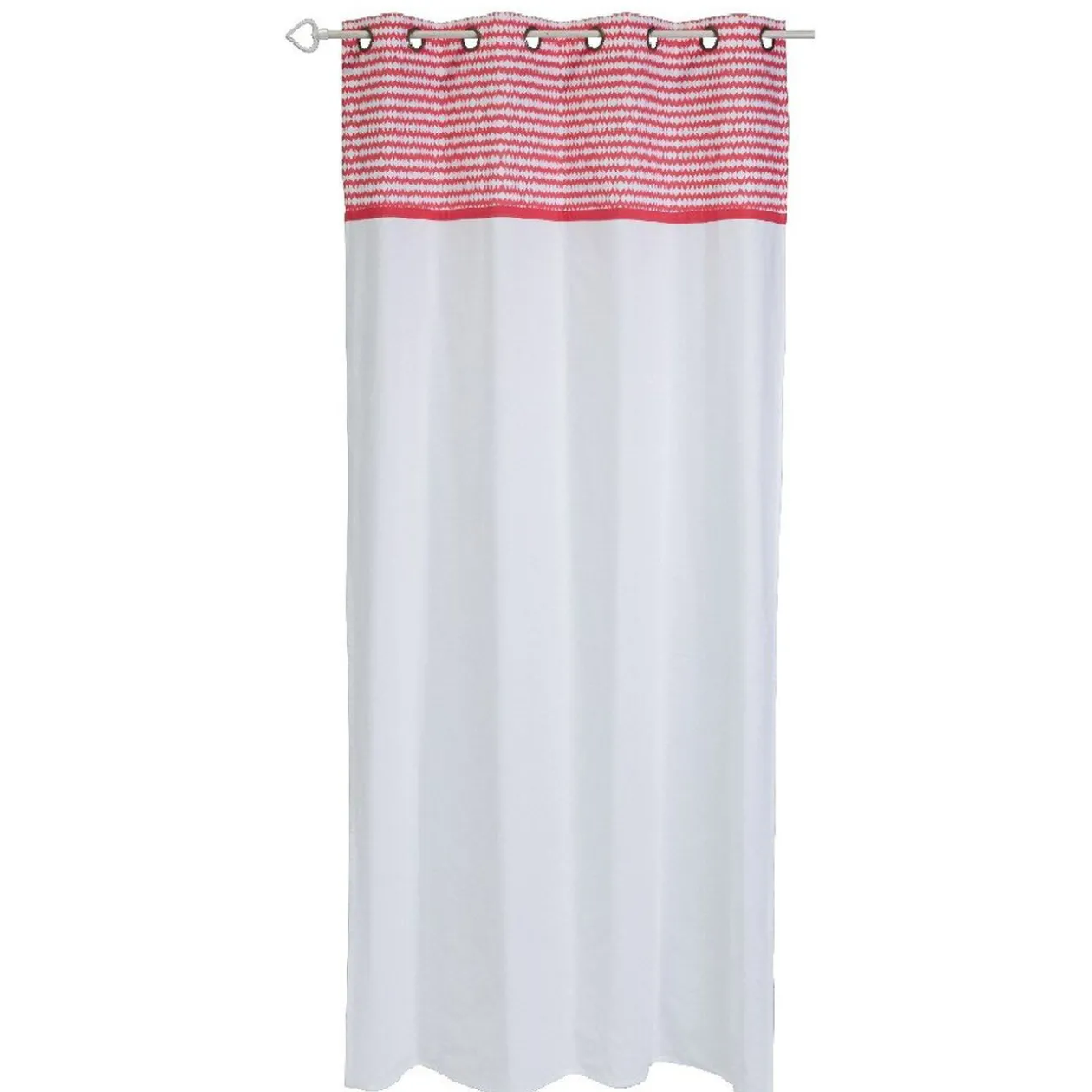 Rideau blanc avec motif déco zig zag blanc et rose sur la partie haute.