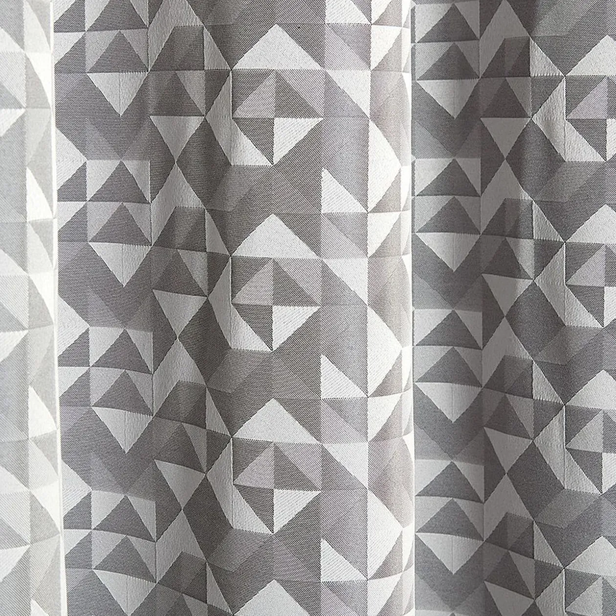 Rideau à oeillets métallique avec imprimé géométrique gris clair et gris foncé.