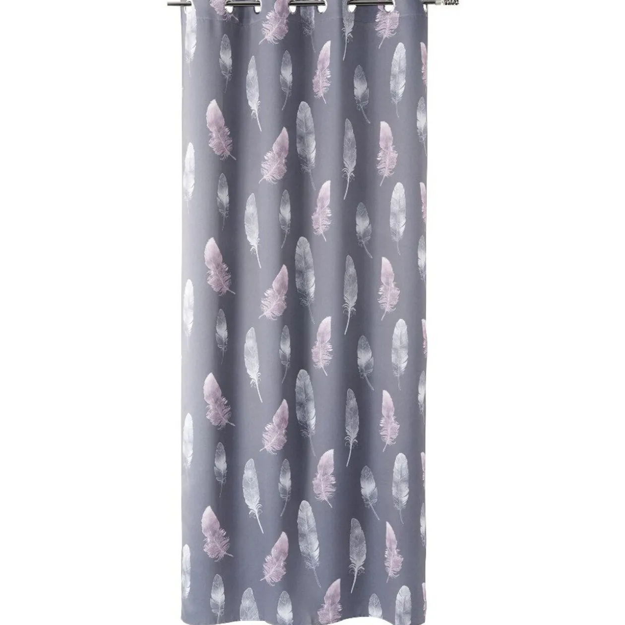 Rideau à oeillets occultant gris motifs plumes roses et grises, dim. 140×260 cm, polyester.