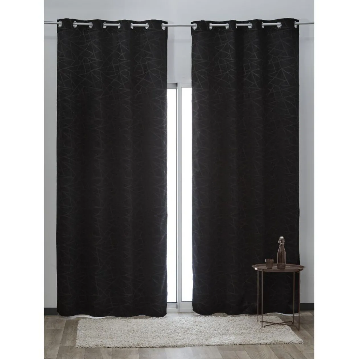 Rideau occultant à oeillets jacquard noir design lignes.