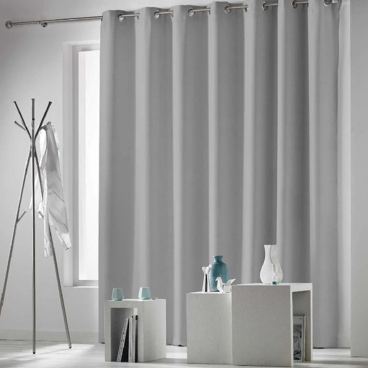 Rideau à oeillets occultant L.260 x h.280 cm, uni de couleur gris clair, pour baies vitrées.
