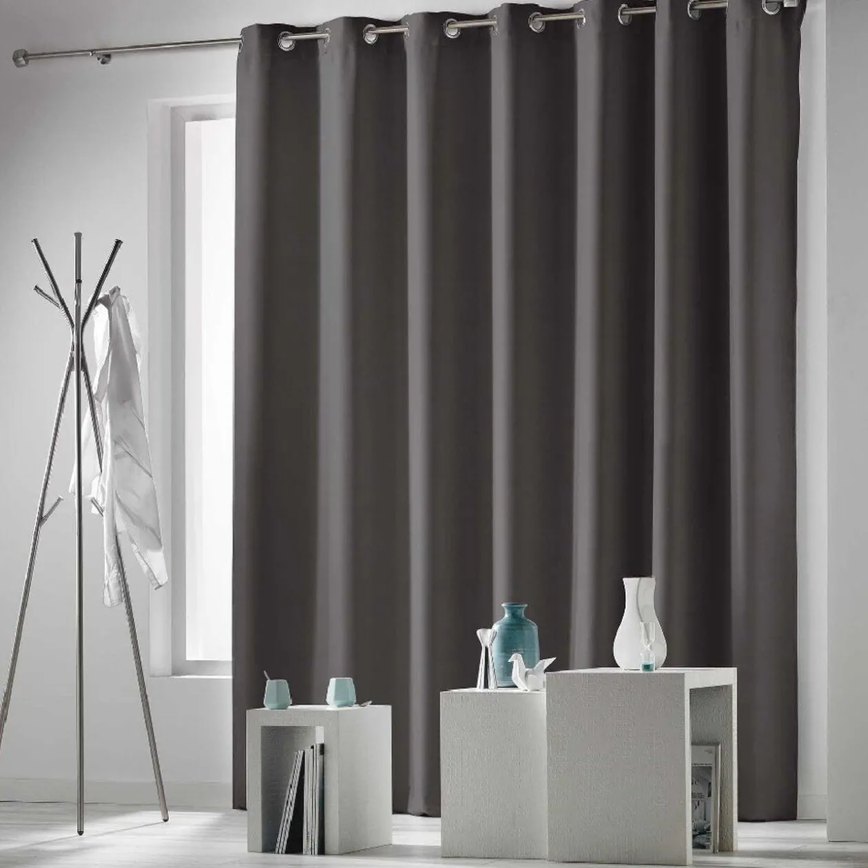 Rideau à oeillets occultant L.260 x h.280 cm, uni de couleur gris foncé, pour baies vitrées.