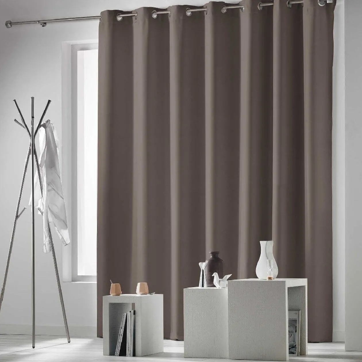 Rideau à oeillets occultant L.260 x h.280 cm, uni de couleur taupe, pour baies vitrées.