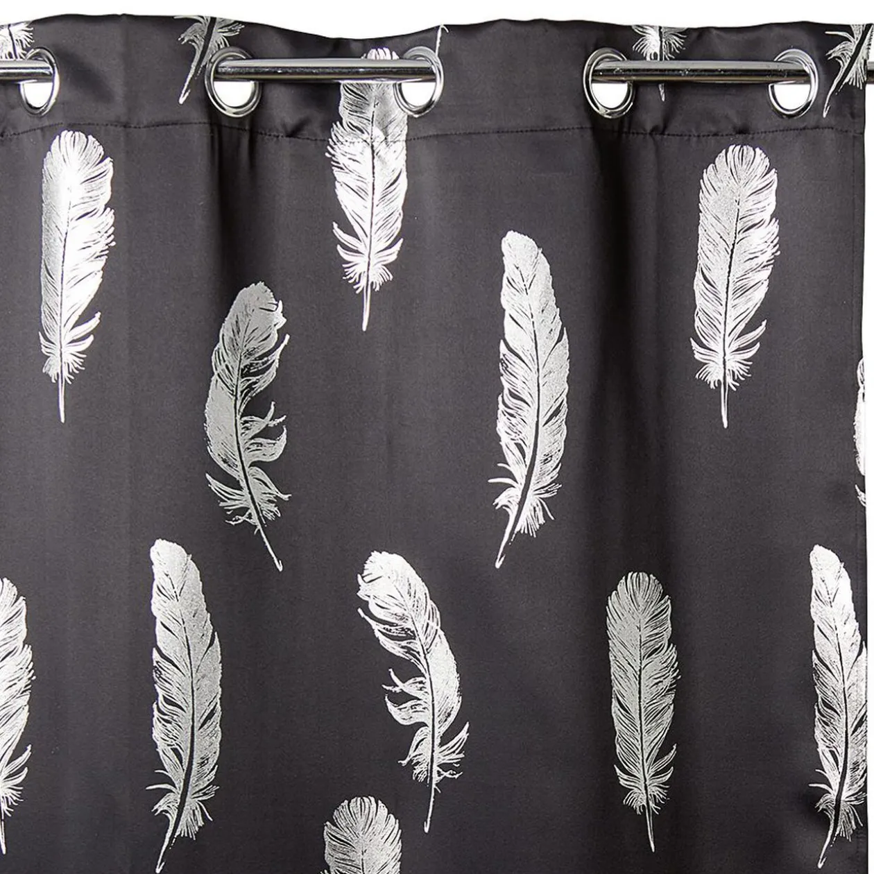 Ce rideau occultant imprimé de plumes argentées existe en fond couleur noir ou orange. Disponibilité selon stock en magasin.