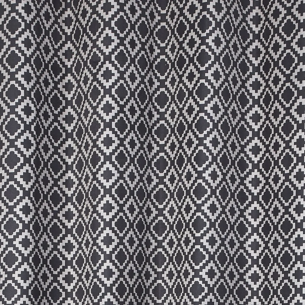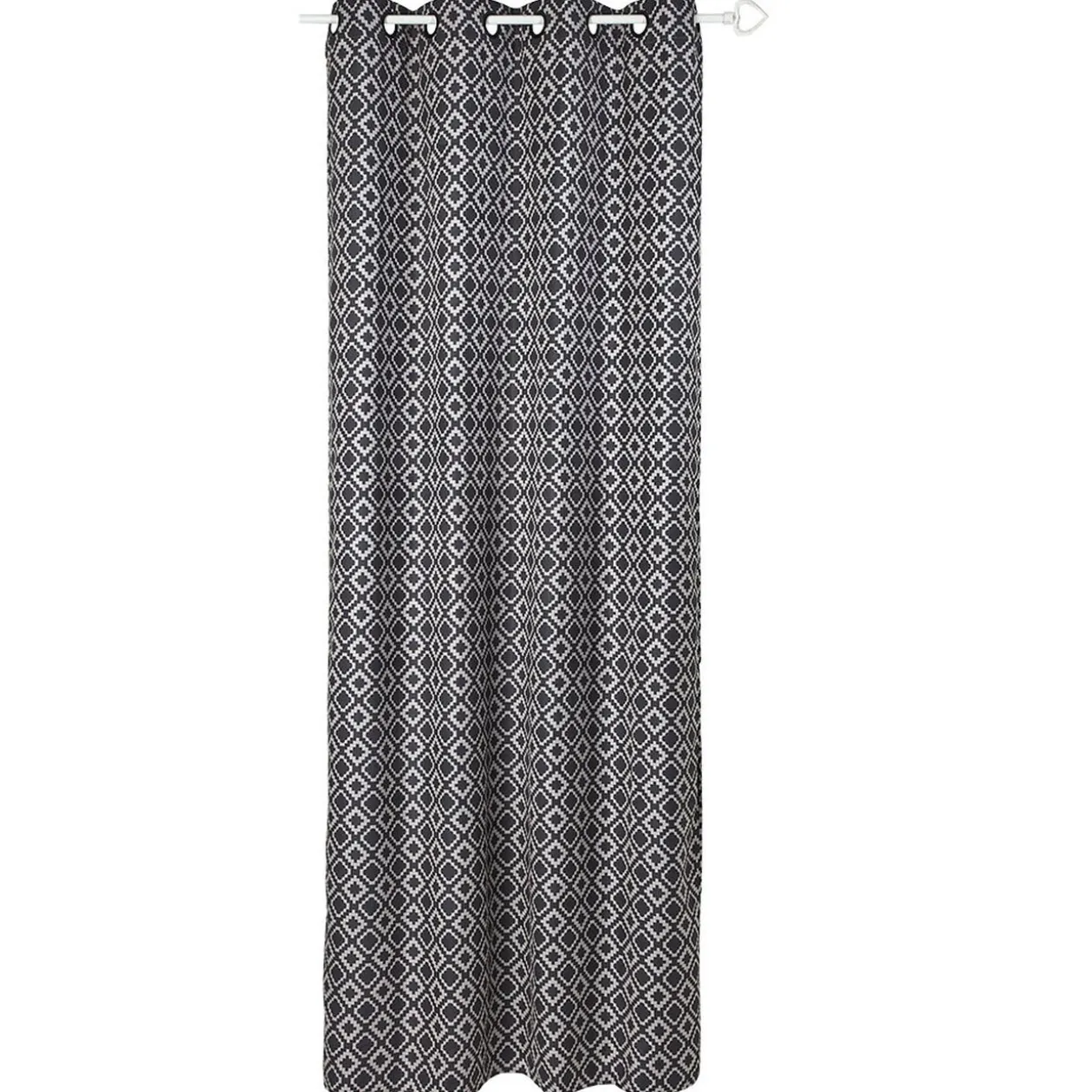 Rideau à oeillets de couleur taupe avec motif géométrique imprimé de couleur noire. La suédine est une matière très douce au tomber impeccable pour habiller vos fenêtres.