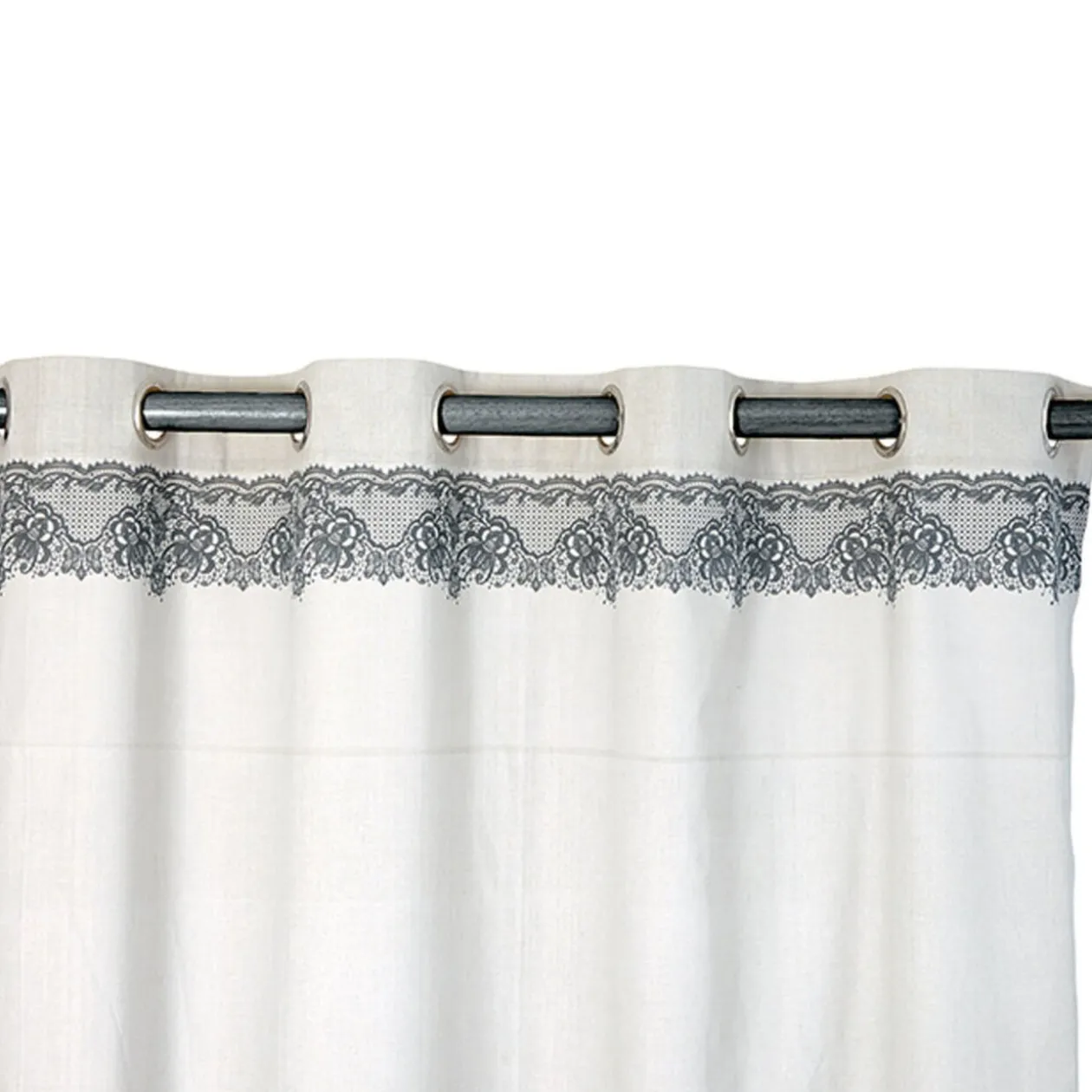 Rideau voilage à oeillets gris clair, effet dentelle gris foncé, idéal pour une décoration de salon ou de chambre.