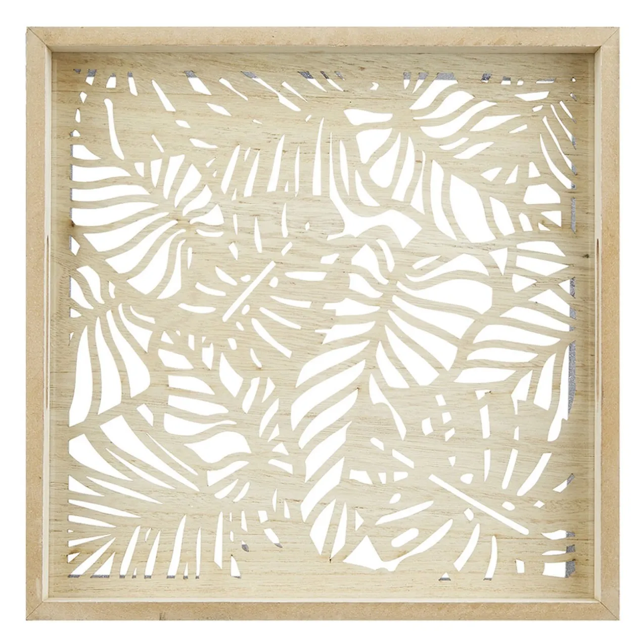 Selette avec armature en métal noir et plateau en bois motif feuillage tropical ajouré recouvert d’un verre.