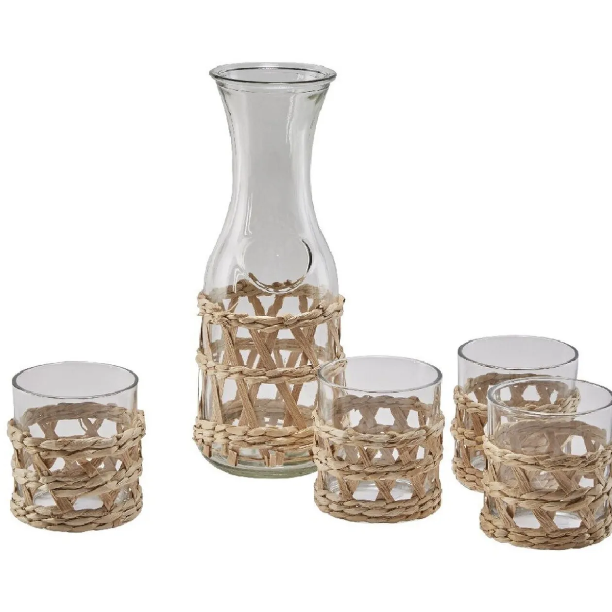 Ce service à boisson au style authentique et plein de charme se compose d’une carafe et de 4 gobelets en verre transparent entouré d’osier tressé. Ce mélange de matières à l’aspect naturel sera du plus bel effet sur votre table de repas!