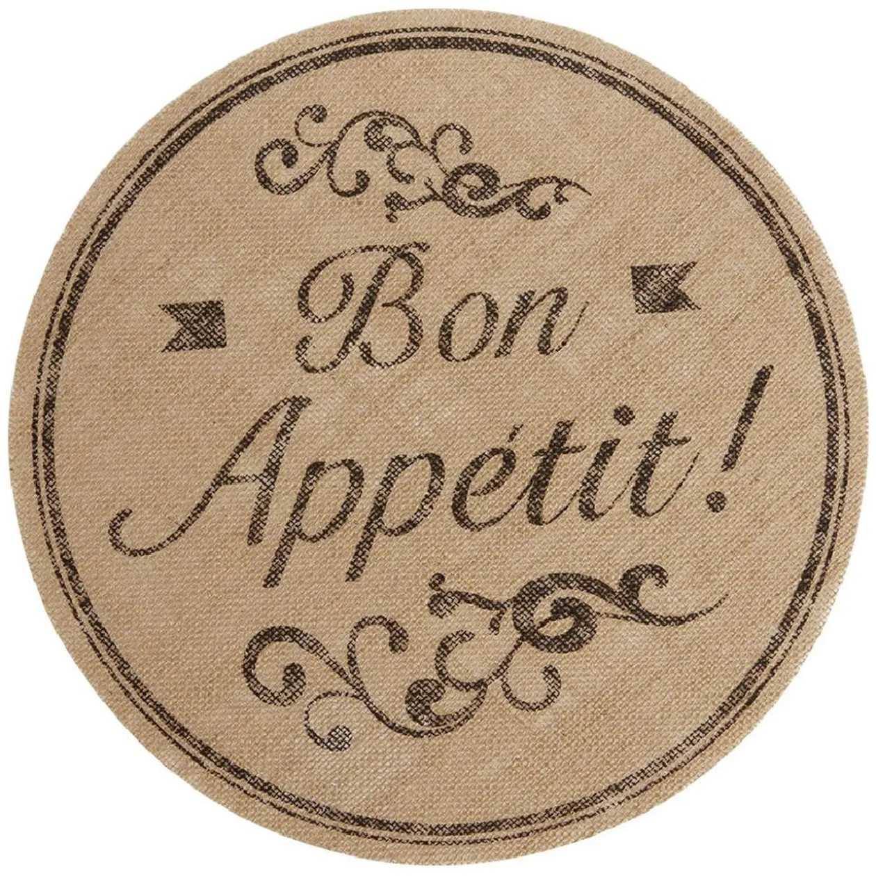 Ce set de table rond en jute naturel au design arabesque et avec l’inscription « bon appétit ! » est idéal pour apporter une touche naturelle et champêtre à votre table de repas.