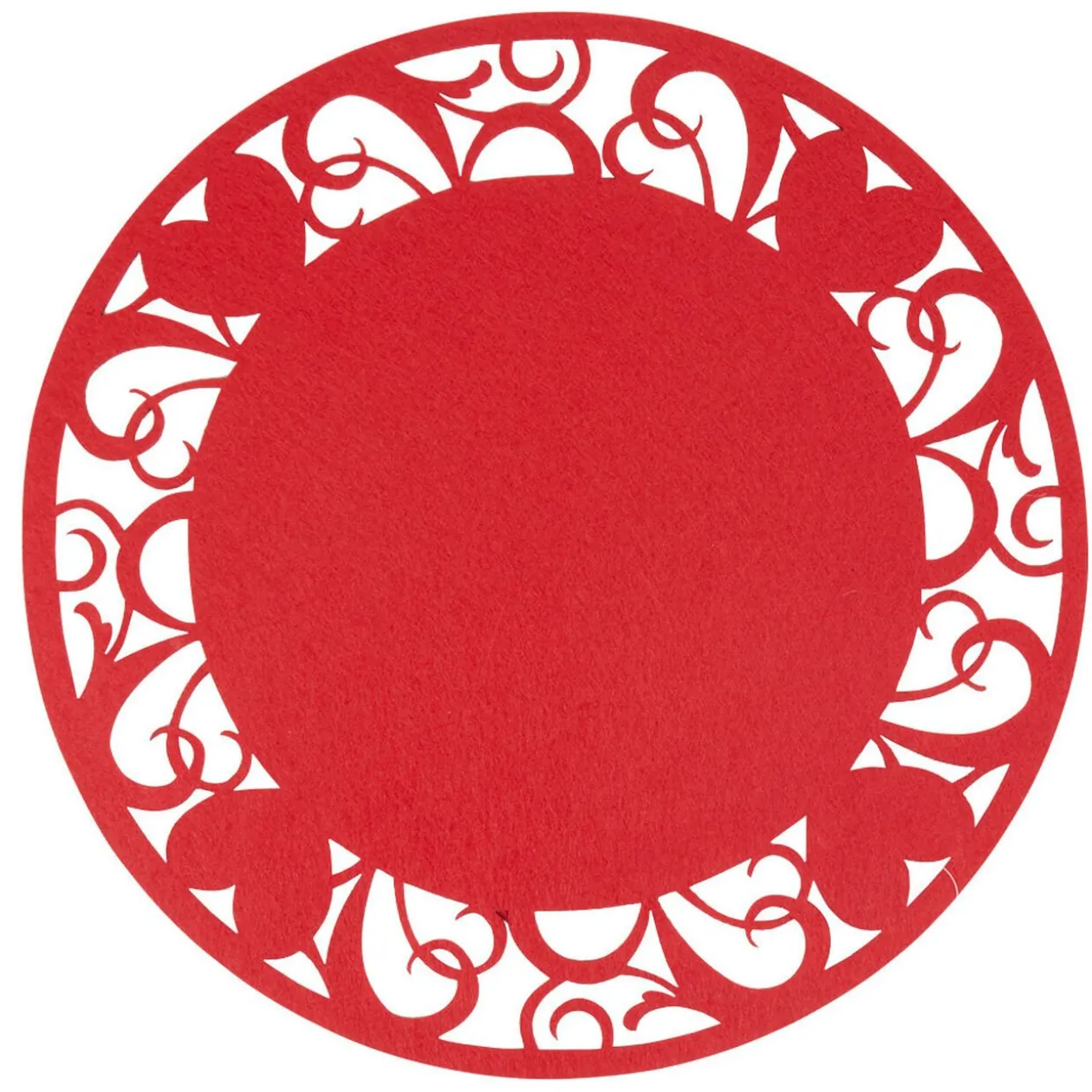 Set de table rond au bord ajouré en feutre rouge, idéal pour la décoration traditionnelle de votre table de Noël.