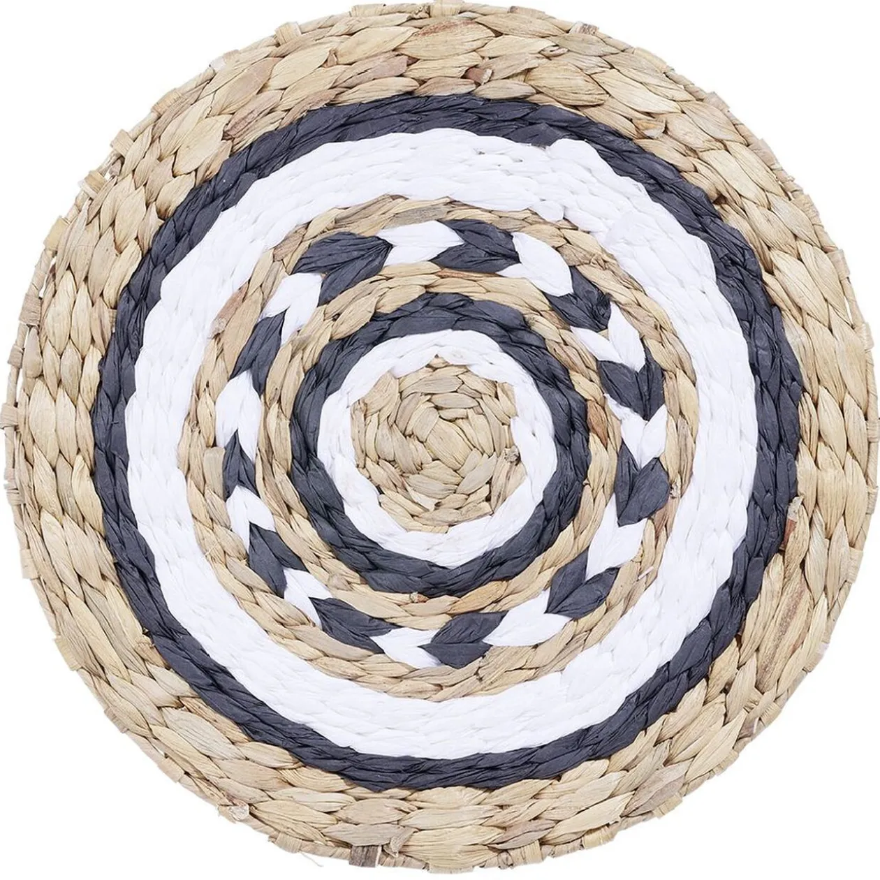 Set de table rond en raphia bleu marine, naturel et blanc.