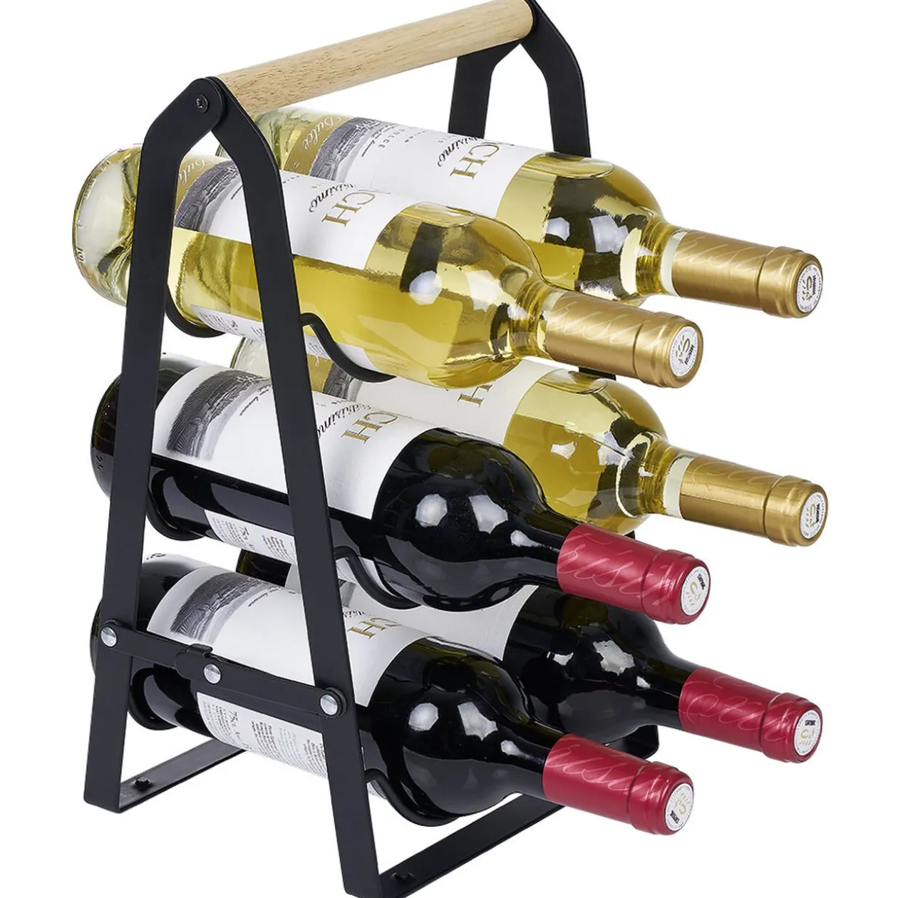Disposez jusqu’à 6 bouteilles sur ce support en métal noir avec poignée en bois.