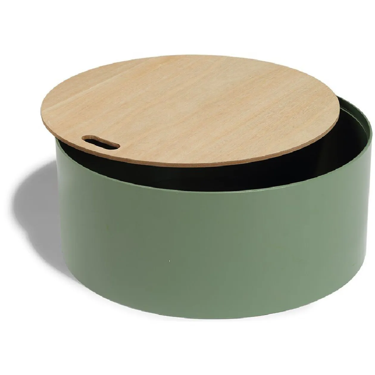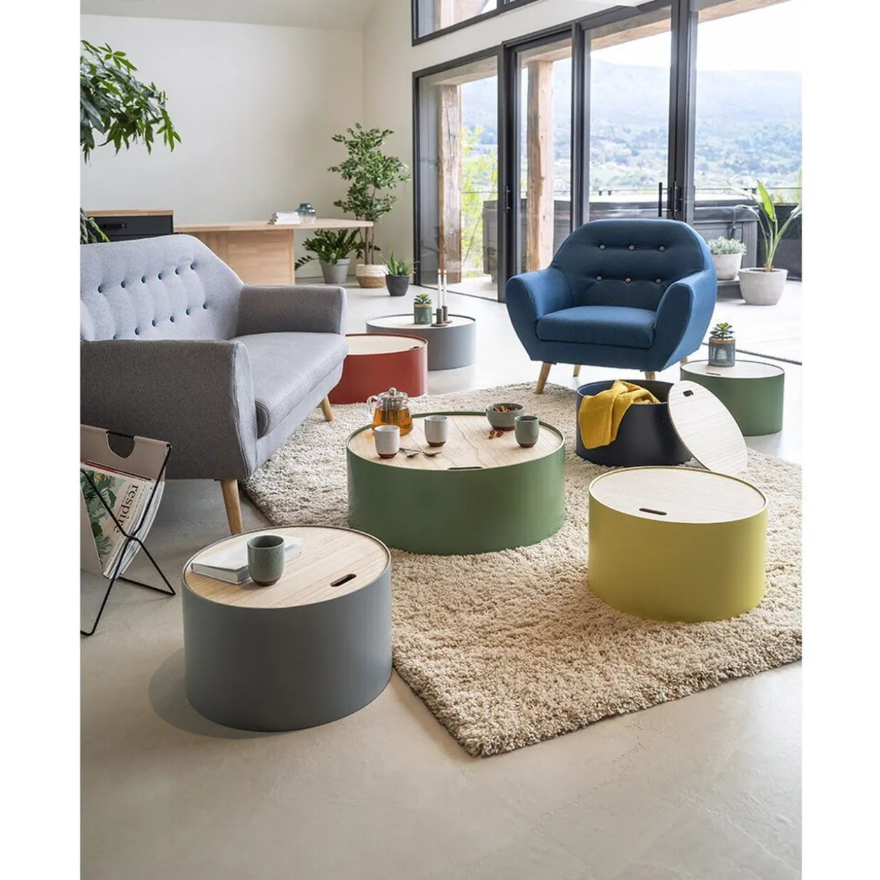 Agrémentez votre salon avec la table basse coffre Kuub ! Sa forme circulaire et sa couleur vert olive la distinguent des autres. Mais le clou du spectacle demeure son plateau amovible : il cache un espace de rangement où vous pourrez disposer des affaires dont vous ne vous servez pas pour le moment. Pratique !