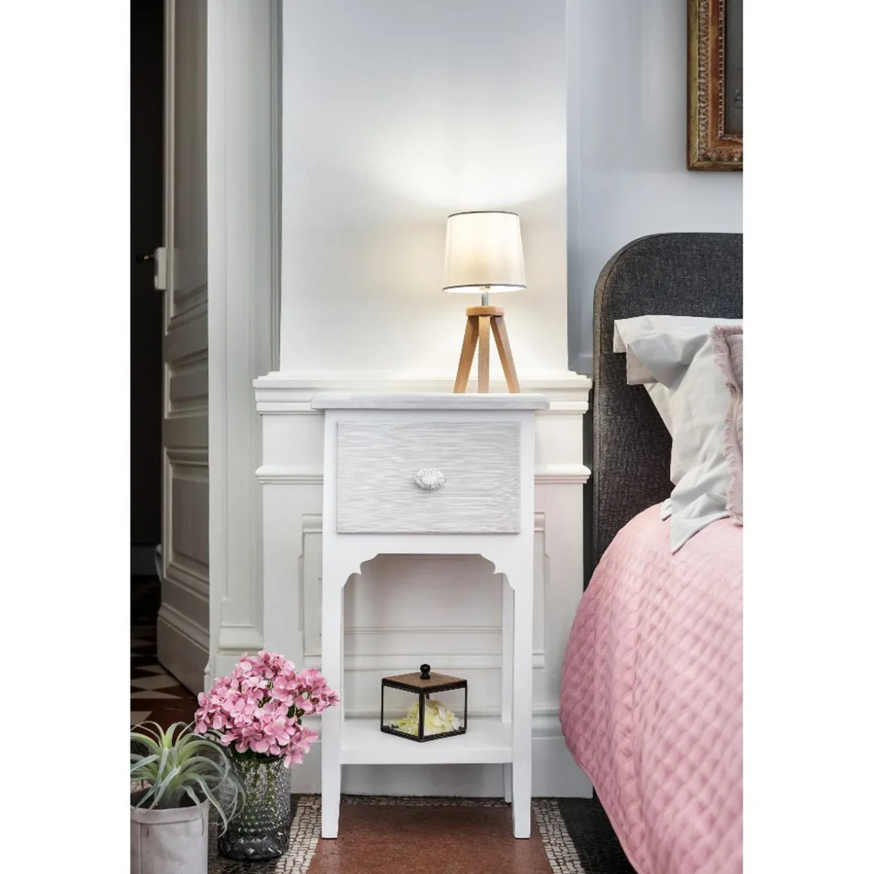 Osez le style romantique dans votre chambre et adoptez la table de chevet Venise. Sa faible largeur vous permet de la disposer où vous le souhaitez sans qu’elle ne prenne trop de place ni ne gêne le passage. Son effet blanchi et sa composition en bois vont faire de cette table de nuit le meuble incontournable de votre chambre. Équipée d’un tiroir, gardez tout votre nécessaire de nuit à portée de main. Son étagère vous permet de poser un objet décoratif, des magazines ou encore une jolie plante. Pour une parfaite harmonie dans votre intérieur, découvrez les autres meubles de la gamme Venise, en particulier le buffet et le chiffonnier. Romantisme assuré !