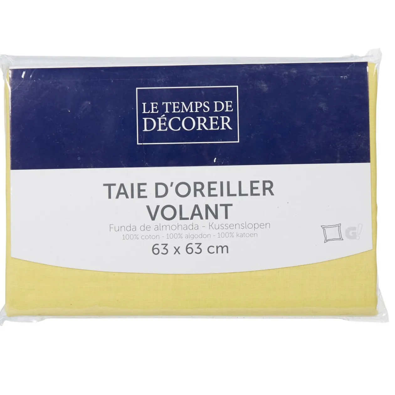 Taie d’oreiller carrée unie de couleur jaune pastel, finition à volants plats.