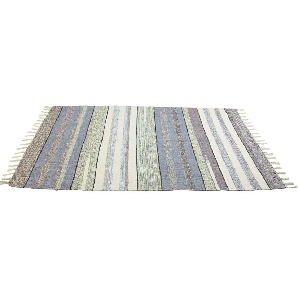 Apportez une touche naturelle et tendance à votre déco intérieure avec ce tapis à franges bayadère beige, marron et verte.