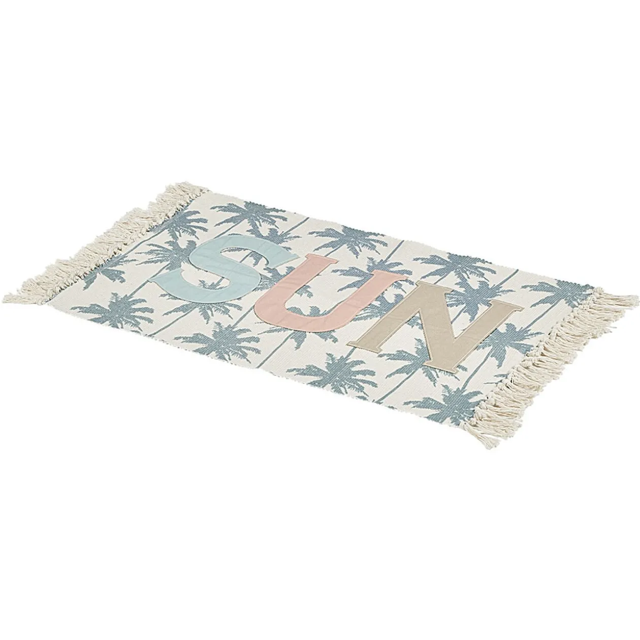 Offrez une touche paradisiaque à votre salon à l’aide de ce tapis rectangulaire à franges avec motifs palmiers et inscription SUN.