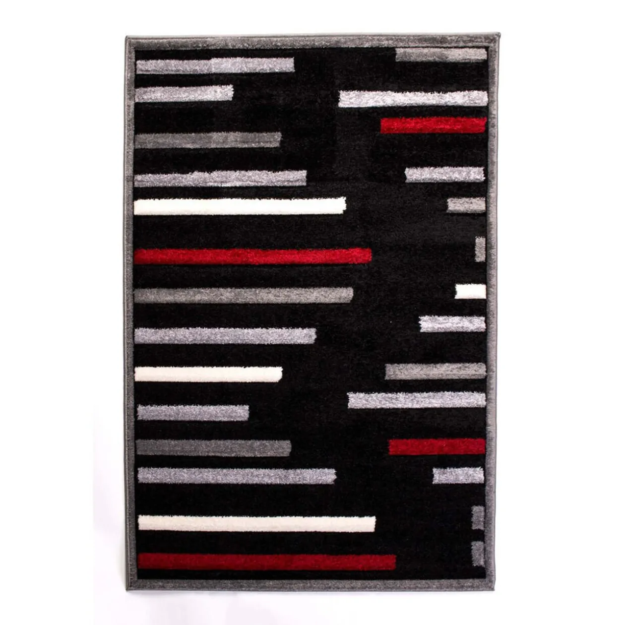 Tapis Shape motifs barres de couleur noir, rouge, blanc et gris.