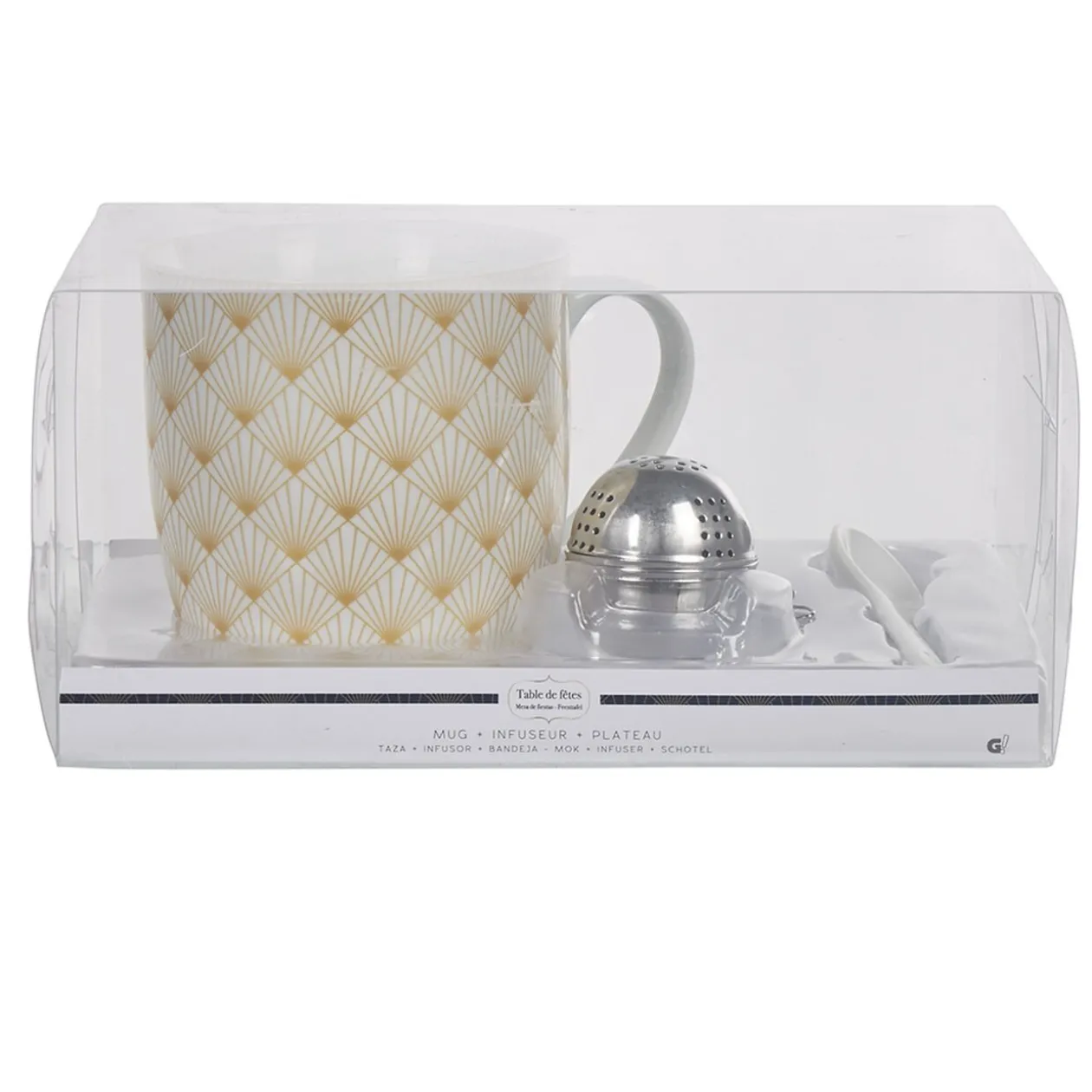 Essentielle aux buveurs d’infusions, ce service complet offre un système infuseur, une jolie cuillère en porcelaine et un plateau. Ingénieux, il vous permettra de profiter d’un moment cocooning en tête à tête avec votre boisson chaude. Le design blanc aux rayons dorés de la tasse en fera un cadeau idéal pour tous les accros de thés. Remplissez la tasse d’eau, placez l’infusion ou le thé en vrac dans l’infuseur. Une fois l’eau infusée, posez l’infuseur sur le plateau et dégustez.