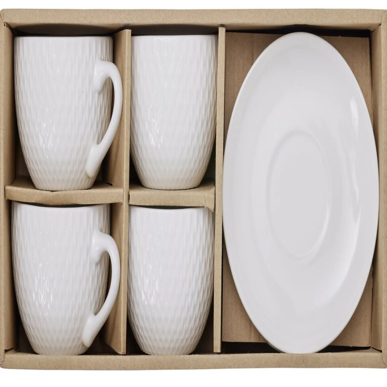 Service de 4 tasses blanches embossées avec ses sous-tasses lisses assorties, idéal pour boire le café !