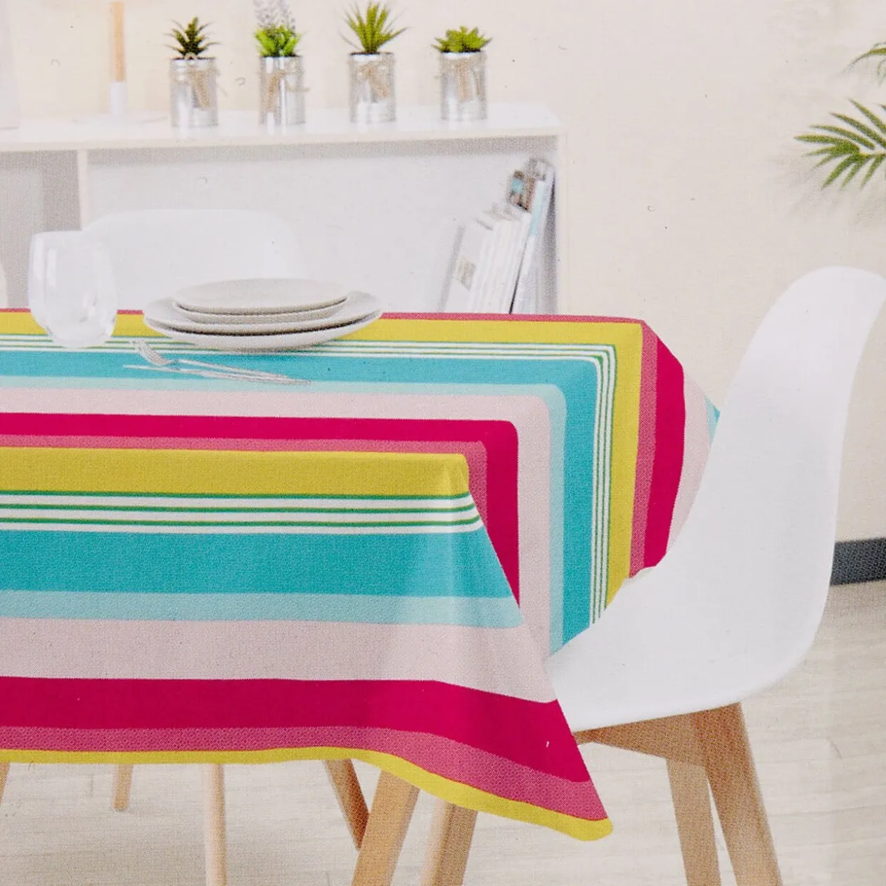 On adore cette toile cirée aux couleurs acidulées et aux rayures épaisses de type bayadère : une nappe facile à nettoyer qui vitamine votre déco de table !