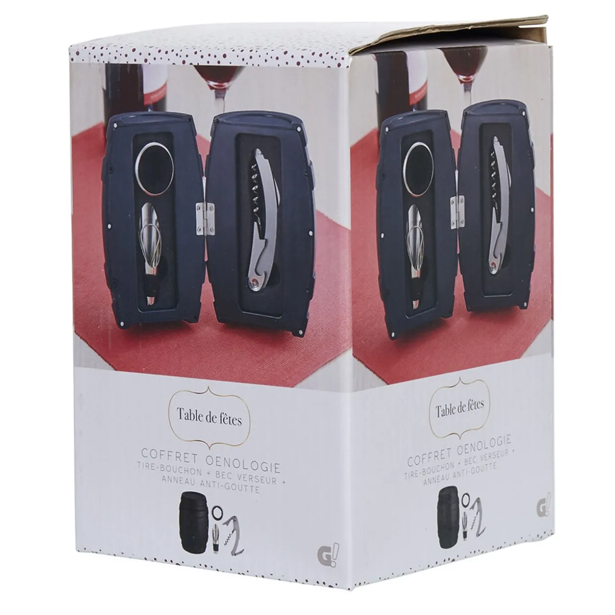 Offrez un cadeau peu conventionnel et rustique qui sera très apprécié des amateurs de bonnes bouteilles. 3 accessoires à vin rangés méthodiquement dans un tonneau de vin noir. Un objet chic et pratique avec un tire-bouchon décapsuleur, un bec verseur et anneau anti-goutte pour servir votre grand cru avec classe.