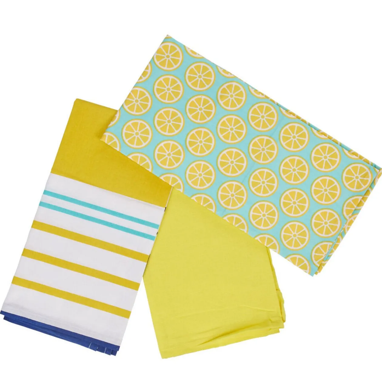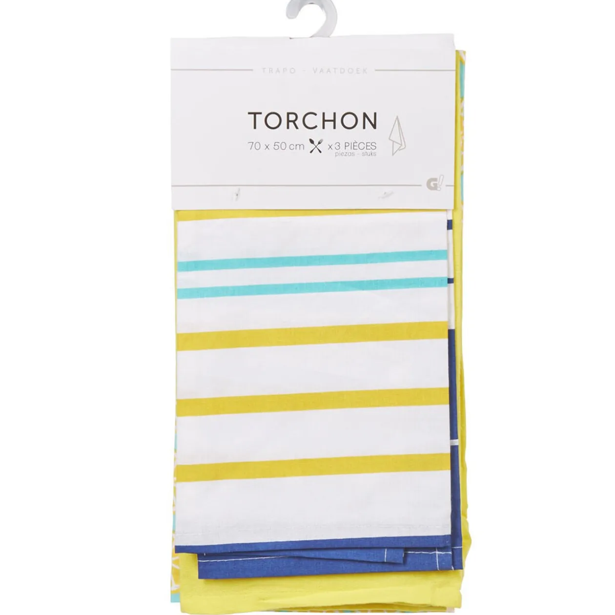 Lot de 3 torchons de couleur blanc, jaune et bleu.