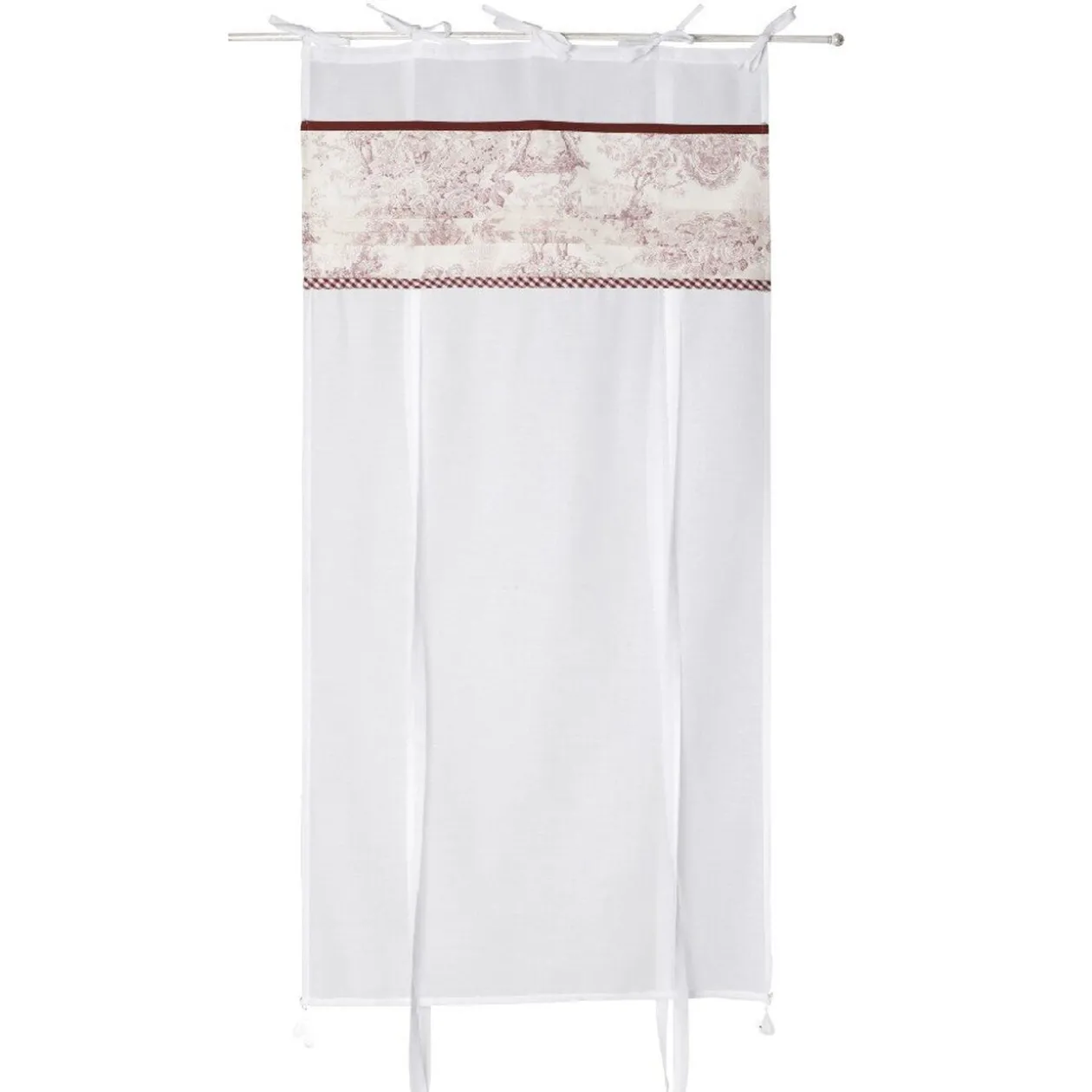 Paire de vitrage de couleur blanc, rouge et beige, motif toile de Jouy. Avec rubans à remonter de chaque côté.