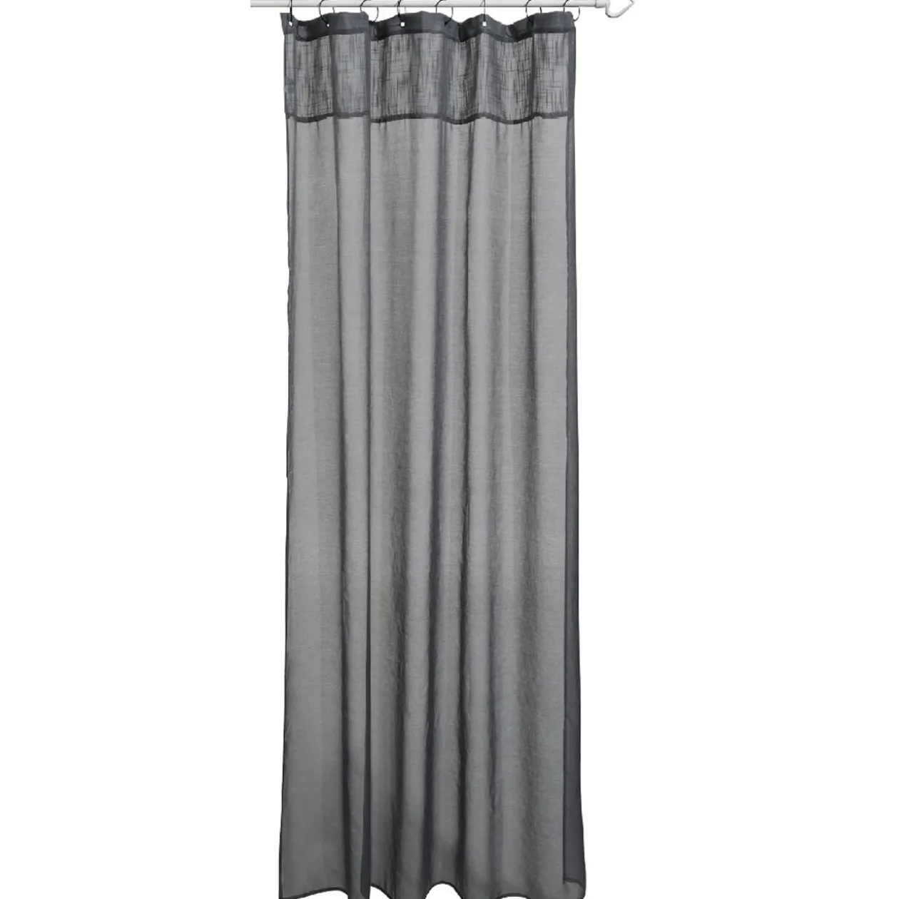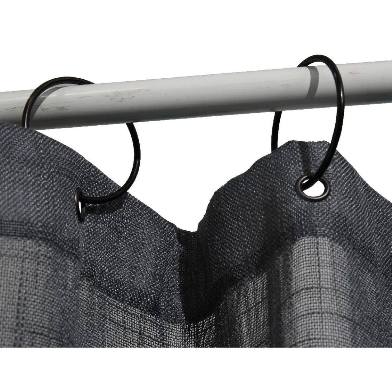 Voilage à oeillets uni bleu avec suspension anneaux noirs.